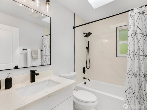 Stunning like-new tri-level in Lynnwood — fully renovated and move-in ready! The main level boasts new LVP flooring in the living room and kitchen, opening to a bright sunroom and back deck—perfect for indoor/outdoor living. Bright, open-concept kitchen with quartz counters and stainless appliances flows into elegant living areas with marble and hardwood floors. 4 bedrooms, 3 baths, fresh paint, RV parking, long driveway, mature landscaping, and NO HOA. Walk to parks and trails; minutes to I-5, Alderwood Mall, Edmonds College, light rail, shopping, and dining. A rare turnkey gem!