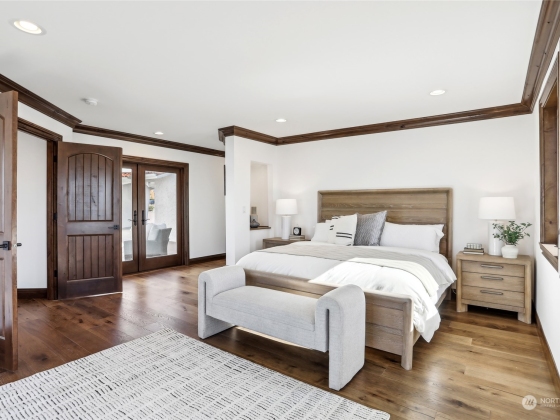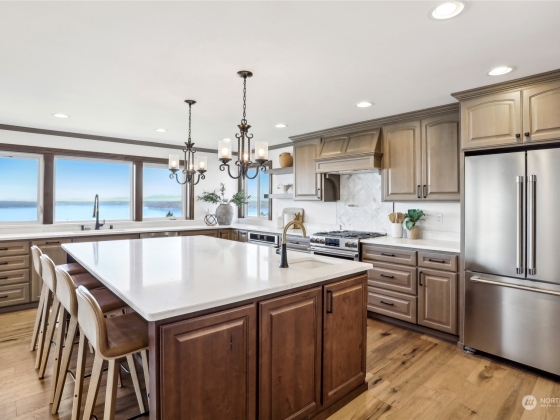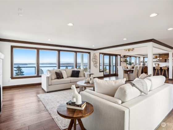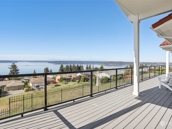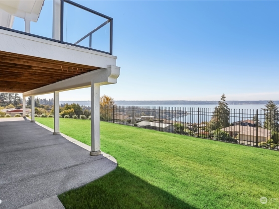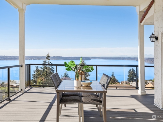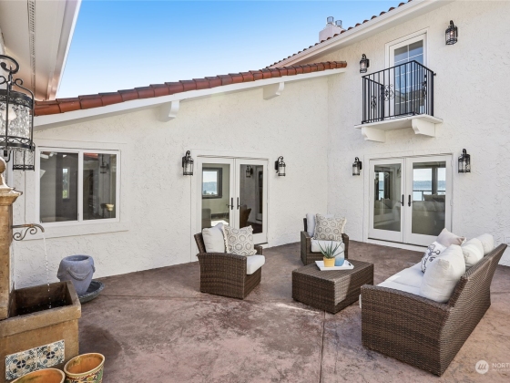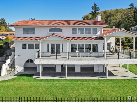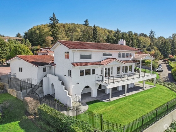Spectacular Spanish Colonial & Mission Revival w/ expansive west facing views of the Puget Sound & Olympics. Be the first to ever live in this masterfully built home! Exquisite attention to detail throughout, including a bell tower, arches, large carved wooden doors, hand-painted accent tiles & finely crafted iron work that graces the stair railings & front gate. Dramatic foyer w/ soaring ceilings, a sprawling great room, formal dining area & main floor primary suite w/ private deck access, walk-in closet & 5 pc bath. 2 BDs w/ attached baths on the top floor & a rec room, bonus room w/ wet bar & 2 BDs on the lower level. Immerse yourself in the outdoor spaces including an interior courtyard w/ a water feature, patio & wrap-around view deck.