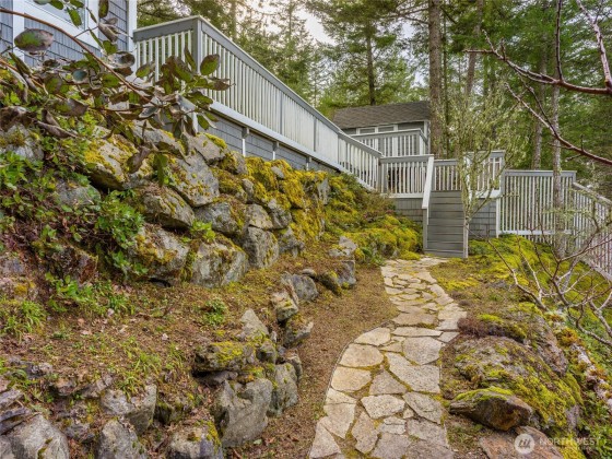Northwest water views and summer sunsets await! Step inside this lovely 3 bedroom, 2.5 bath home to find a light-filled interior, floor-to-ceiling windows, vaulted ceilings, ft. a well-appointed kitchen boasting stainless steel appliances and granite countertops. Retreat to the primary bedroom with an en-suite bath, spacious closet, and private balcony. Outside, the deck is perfect for enjoying the tranquil surroundings. Soak in the hot tub and take in the views! Terraced garden with fruit trees, fenced in. Attached 2-car garage. Located minutes from Moran State Park and 10 minutes from Eastsound.