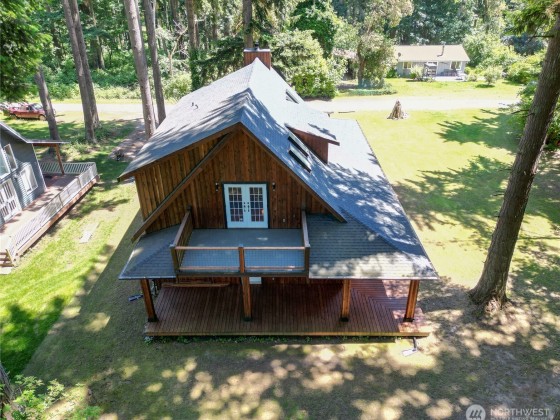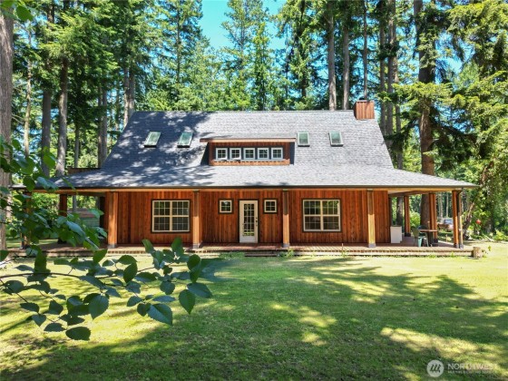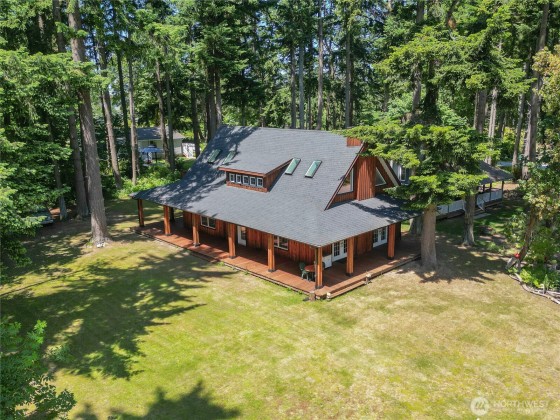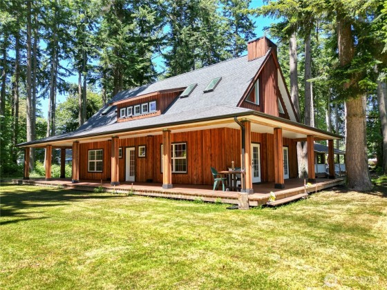 Gorgeous custom cedar home w/wrap around covered porch on private island walking distance to 9 hole golf course! Inside be greeted by the spacious great room featuring vaulted ceilings, beautiful wood burning fireplace & french doors leading to the deck. Stunning gourmet kitchen w/custom cabinets, walk in pantry, SS appliances & large island w/toe kick heaters. Guest room, den/3rd bedroom, luxurious full bath w/heated floors & large laundry rm complete the main level. Retreat to master suite w/private deck, built in cabinets, lavish tile shower w/dual shower heads & heated floors. Loft w/bar. Hat is close to Everett & features beautiful beaches, sport court, picnic area & marina 1 year golf membership included. Possible owner financing