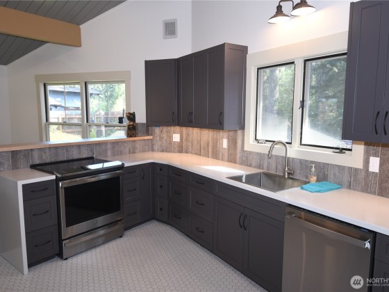A private lot on Alderbrook Country Club’s first fairway. From the redwood deck you’ll enjoy the summertime sunrise and sunset colors cascading across your 180-degree view of the fairway. Two bedroom and two bathroom home has been completely remodeled with new kitchen, including new fixtures, quartz counter tops, cabinets and kitchen appliances, as well as new vinyl plank flooring, new tile throughout, wood stove, skylight, and roof. Additional parking area for other vehicles or trailer. So many activities at your fingertips from playing golf, enjoying the serene Hood Canal or visiting the Olympic Mountains.