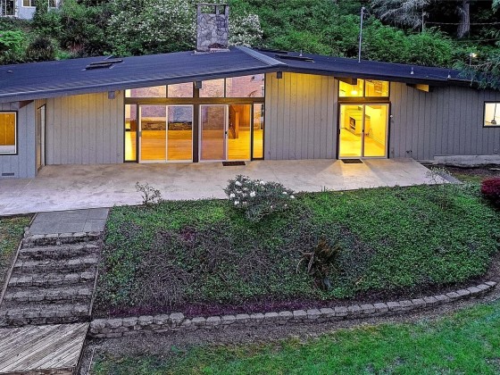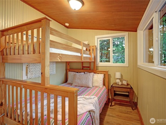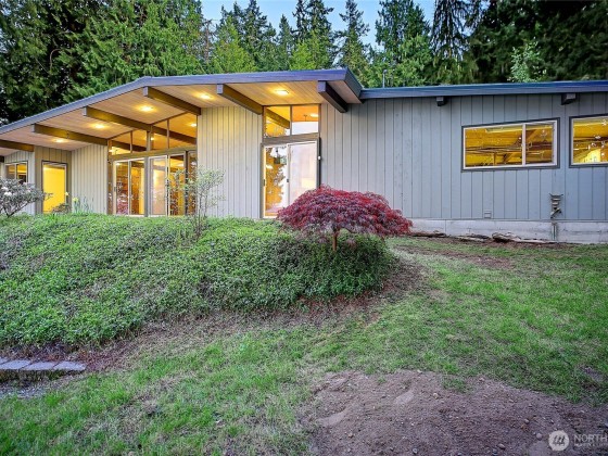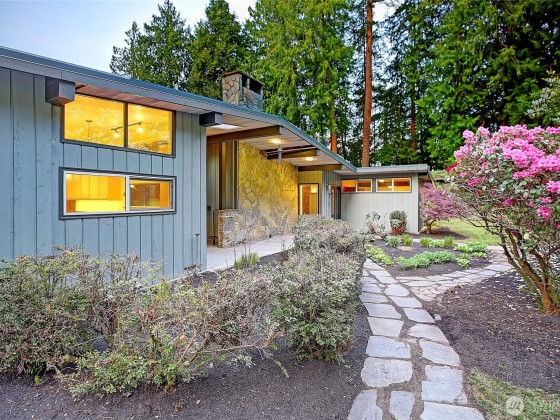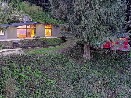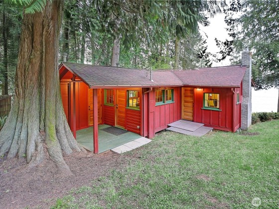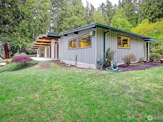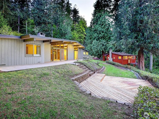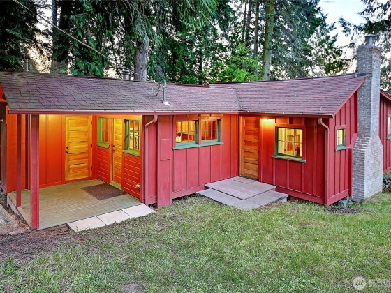 This great Modern style gem is situated on a double lot at the water's edge on 200 feet of waterfront, with easy access to your private and sandy beach. Also on the property is a charming, 608 sq ft fully-equipped cabin in perfect condition for any overflow. With open living space, plenty of outdoor area, and fantastic views from every corner, this mid-century modern has a great feeling of seclusion on 6+ acres. Build a fire and enjoy your surroundings from the large picture windows or the expansive patio. Whale watching, beach combing, kayaking, or birding, it is all in your backyard. Mature landscaping lends you privacy while surrounding you with the beauty of nature, all with sweeping mountain and sound views, enjoy the Island lifestyle.