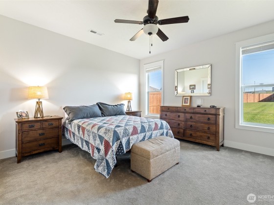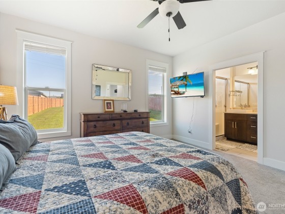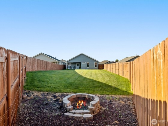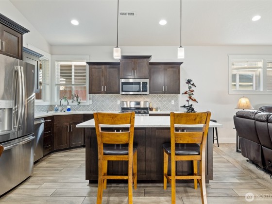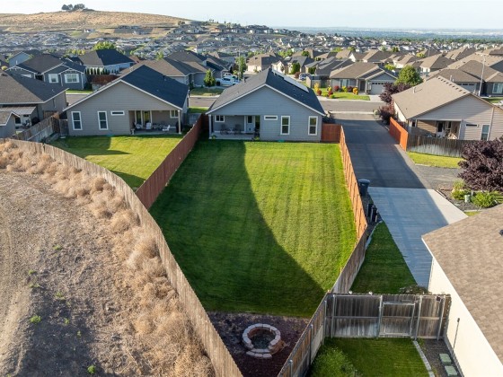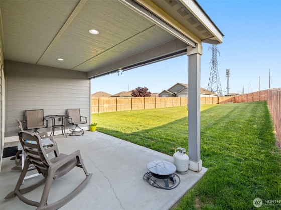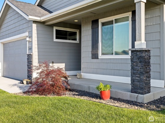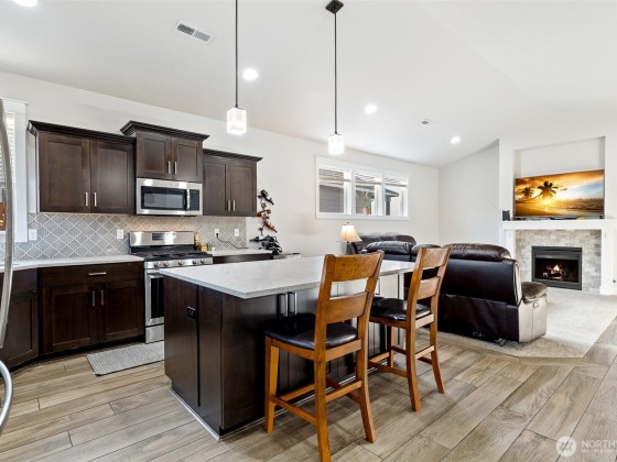 Meticulously maintained quality move-in ready Southridge home in perfect condition on large lot with solar panels. Open concept kitchen, quartz counters, island/breakfast bar, cabinet high back splash, staggard cabinets, soft close hardware, stainless appliances, gas range. Vaulted ceilings, “wood look” tile flooring, gas fireplace with tile surround, wood wrapped windows, plenty of natural lighting. Nice separation between bedrooms, primary bedroom has great walk-in closet and attractive bathroom. Laundry room has cabinets and a sink. Finished garage, possible side access to huge, fenced back yard, fire pit, covered back patio. Great neighborhood near shopping, schools, restaurants, freeways and city views from the covered front porch.