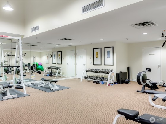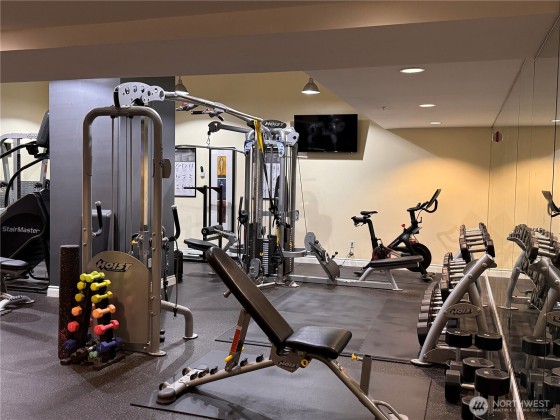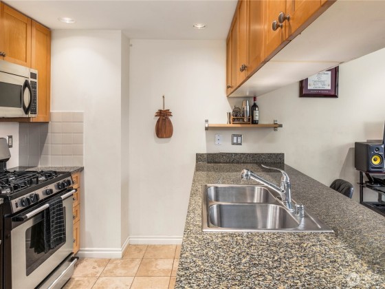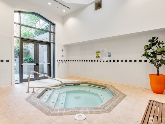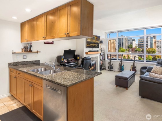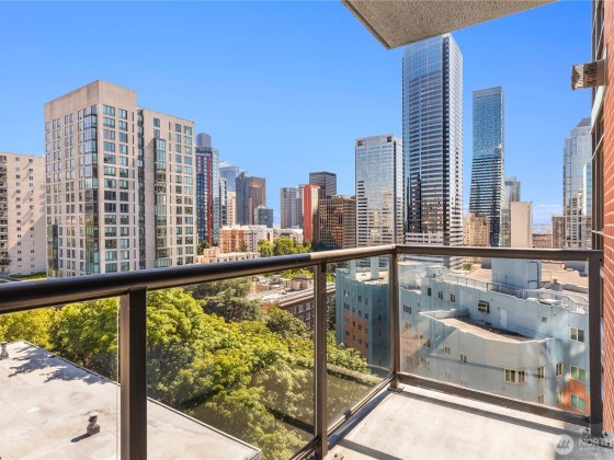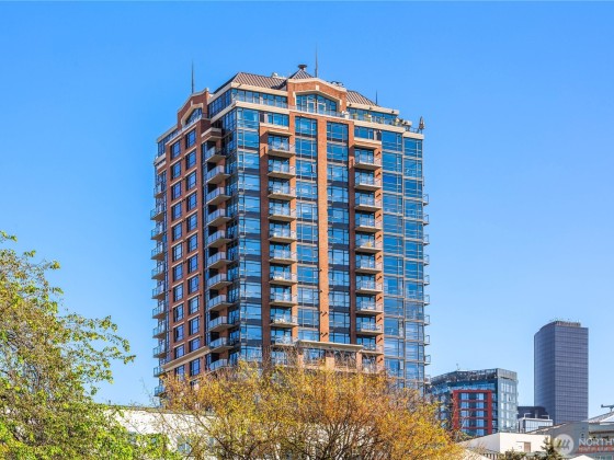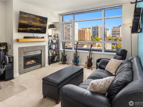 This is a unit in the Meridian Tower with beautiful views of the city and a private balcony to enjoy it. The open-concept floor plan includes a gas fireplace. The kitchen has granite counter tops, stainless steel appliances, and gas cooking. Secured parking and a storage unit are included. Amenities in the Meridian Tower include secure access, concierge services, fitness room, hot tub, steam room, game room, conference room, theater room, club room, guest parking, and a guest suite. The location is situated between Downtown Seattle, First Hill, and Capitol Hill, close to various restaurants and shops.