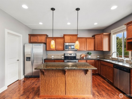 Beautifully maintained 4-bedroom, 2.5-bath home in a convenient Puyallup location close to Shopping, Dining & Amenities. The open-concept floorplan features warm hardwood flooring & spacious living areas filled with natural light. Upgrades include Trimlights - making holiday lighting a breeze, a full-yard Sprinkler System, efficient Heat Pump providing year-round heating & cooling & custom Closet Organization Systems. The finished garage with epoxy floors adds both style & function. Enjoy a private backyard with a large deck, fenced grass area & Generator Hookup—perfect for entertaining or relaxing. This move-in ready home combines comfort, convenience & thoughtful upgrades throughout. No HOA, all Appliances Inlcuded & Move-in Ready!