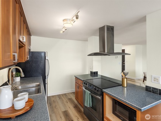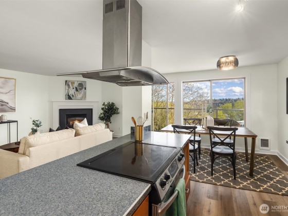 Bright corner retreat with partial Lake Union views! This peaceful 4th-floor unit offers rare serenity with no one above. Nestled beside Trolley Hill Park, it features a stylish designer kitchen with updated flooring, shaker cabinets, and stainless steel appliances. A spacious balcony extends the living space, while the primary and second bedrooms sit near a full bath. Enjoy convenience with secure parking, in-unit laundry, and generous storage. Ideally located in Queen Anne with a well-run HOA—just minutes to Seattle Center, SLU, the Gates Foundation, local dining, coffee spots, and quick access to Highway 99. A quiet, urban escape with no upstairs neighbors!