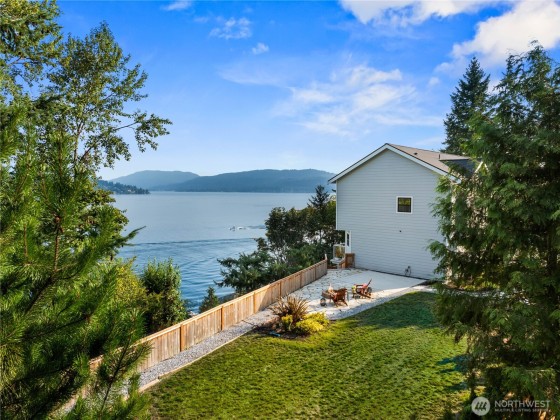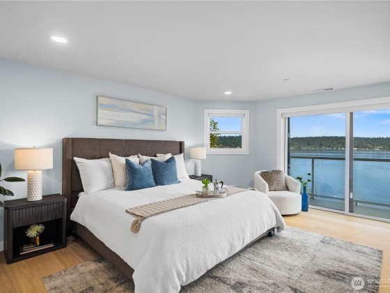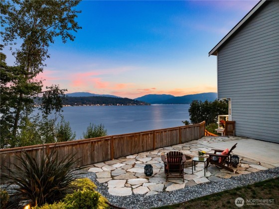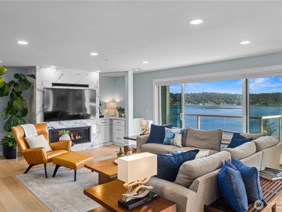 Perched above Lake Sammamish, this 2023 reimagined contemporary captures panoramic views—moonlight on glassy waters, eagles soaring and ski boats tracing silver ribbons below. A serene coastal palette of hardwoods, white cabinetry and soft blue accents echoes the lake beyond. Open living flows to view-filled decks for seamless indoor-outdoor living. Two primary suites—one on the main, one above with spa-inspired wet room—offer retreats of luxury, joined by lakeside bedrooms where every window frames water. A flat fenced yard with firepit, abundant parking, and added storage beneath the deck enrich daily life. Approved plans for a 670 SF ADU above the garage add future flexibility. A rare blend of design, versatility, and breathtaking views.