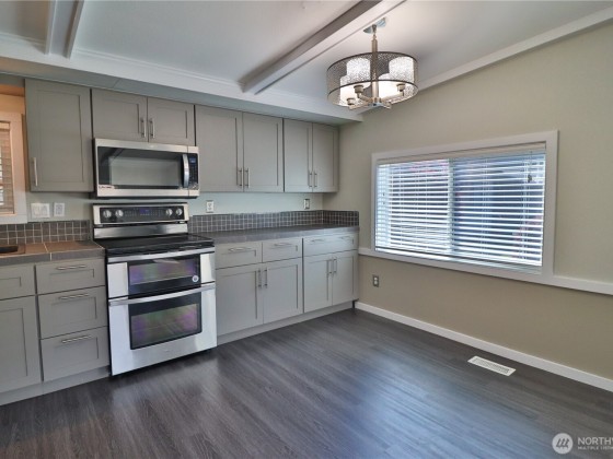 Fully remodeled 2 bd, 3 bath home in Kloshe Illahee, a lively 55+ community with resort-style amenities-clubhouse, pool, hot-tub, sauna, exercise room and more. This open layout features vaulted ceilings, AC, and durable LVP flooring throughout. The kitchen offers sleek quartz counters, SS appliances, and brand-new cabinetry. BRAND NEW ROOF! The spacious primary suite includes a large walk-in closet and a luxurious 4-piece bath with a jetted tub and walk-in shower. The Jr suite has its own ¾ bath and built-in closet. Enjoy the enclosed front patio year-round or head to the back yard for a tropical feel yard under the gazebo. 1 large shed w/power and 2 smaller sheds. 2-car carport. Near dining, shopping, and freeways. Pk fees include W,S,G.
