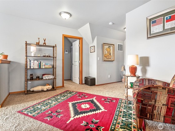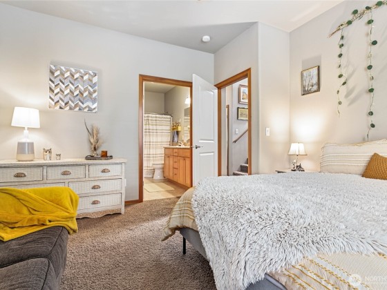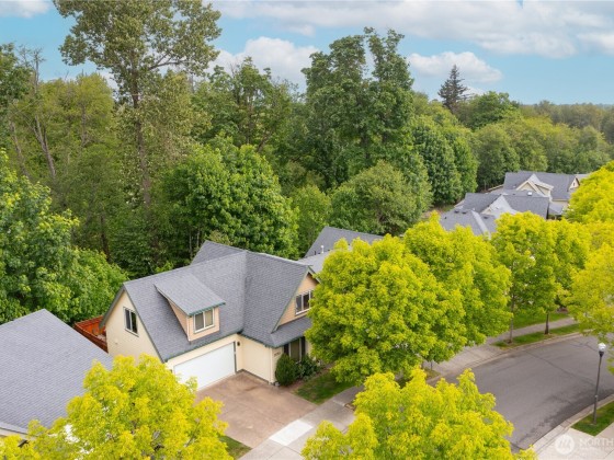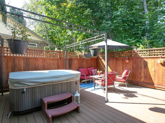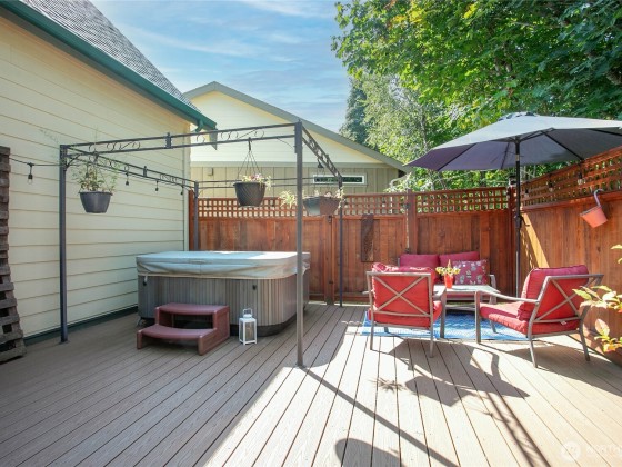 Regal Malloy Village home offers style & function in a private yet convenient Ferndale location. Main-floor primary suite + 3 second story bedrooms spread over more than 2000sqft. Chef's kitchen features maple, granite & stainless and is open to generous high-ceilinged living room w/ gas fireplace. Sliders take you to the expansive sun deck with private hot tub overlooking greenbelt and creek. Upstairs has usable loft landing surrounded by 3 more bedrooms, a full bath and a true laundry room w/ storage. Finished garage is great for projects, storage or parking and features new HVAC system including central air. Walk-in closets, great window package and real hardwood floors. Even an HOA that mows your lawn!