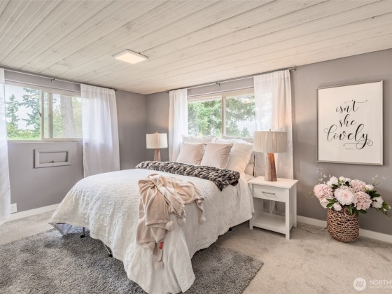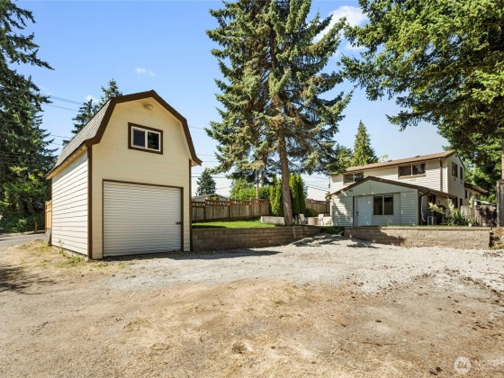 Located on Burien’s alluring Gregory Heights hill, this updated mid-century tri-level blends rustic charm with modern comfort just minutes from Seattle. The open main level features vaulted ceilings, premium white oak hardwood floors with Japanese Maple stair treads, quartz counters, stainless appliances, and a stylish island. The lower level offers flexible space ideal for potential multi-generational living. Enjoy year-round comfort with a tankless water heater, gas heat, and mini-split A/C. Entertain guests on the beautiful large patio with terraced lawns. Ample parking includes RV/boat space, and a 10’x20’ outbuilding with 16’ ceiling. A must-see gem!