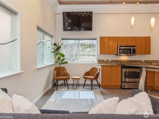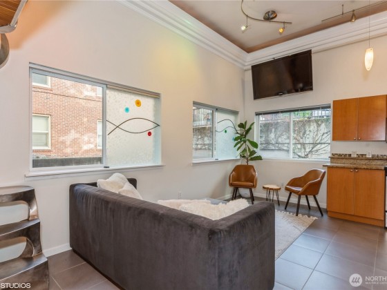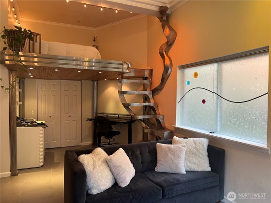 Unique One-of-a-kind loft in a perfectly located lower Queen Anne condo with perfect view of space needle. This artist rendered loft has 14 feet ceilings, custom glass fixtures and lighting with handcrafted glass. Custom made steel kitchen island. This cozy Loft with new updated bathroom, custom staircase and window coverings and lighting is ready for a new owner. Light-filled living room is open to the kitchen and efficient with lots of storage, heated floor and closet space. Washer & dryer in unit. Entertain friend on the rooftop deck w/ magnificent view of city and space needle. Secure garage parking & storage unit. Building is surround with restaurants, coffee shops, grocery stores and few steps to Seattle Center