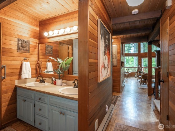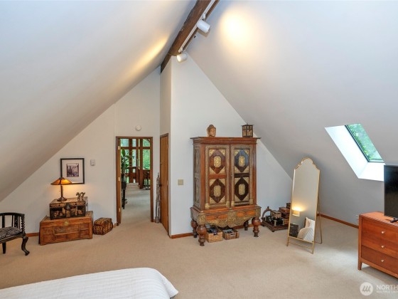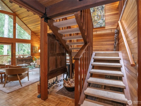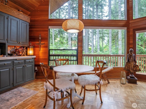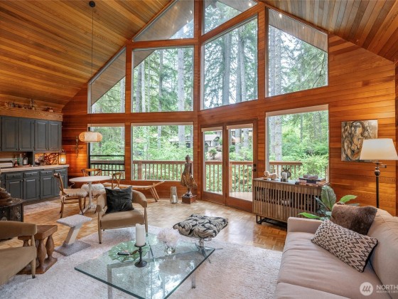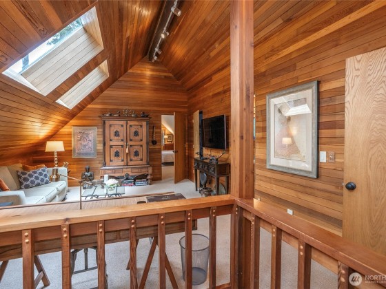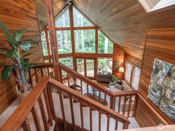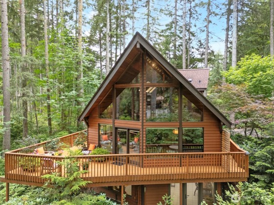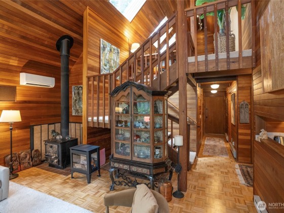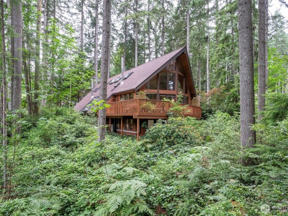 This exquisite chalet feels like you are in remote PNW but you are just blocks from downtown Gig Harbor with restaurants, maritime activities and art galleries. This tranquil oasis in the woods is impressive and unique. Enjoy the vaulted cedar ceilings, inviting ambiance, refinished parquet floors, ductless HVAC, oversized garage, and a lovely deck. The spacious primary suite on the main floor feels like a private sanctuary, complemented by an upper loft office, a large bonus room, and a daylight basement. Originally designed with a one-bedroom septic system, there's ample space to upgrade. Plus, there are several comfortably finished rooms that feel like bedrooms.