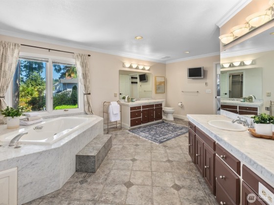 Soak in the breathtaking Sound views & savor the sunsets in Brookacres, a private oasis minutes to downtown Edmonds. Enjoy the lookout, greenspace, trails, beach access, & tennis/pickle ball court in this small gated community. Cozy up by one of 4 fireplaces in this spacious 5 bd, 4 bath home. Vaulted ceilings & huge windows greet you in the living room. Open family room & kitchen lead out to a picturesque deck overlooking the water. The primary shows off w expansive sound views & an oversized bath featuring a WIC, heated floors, walk in shower & sauna. Lower level w separate entrance, living room w FP, kitchenette, bedroom, & bath would be a great MIL suite, au pair living space or dream rec room. All brand new carpet!