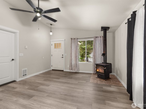 Two bedroom home with an extra room for an office, studio, or guest room. This house offers comfortable living with modern style. Inside you'll find a fully updated house with contemporary fixtures throughout. The living area has a wood stove to keep you warm on those cold nights. The covered back porch is the perfect spot to sit and enjoy your drink of choice while taking in nature. Clearwood offers a resort-like lifestyle with incredible amenities. Explore over 12 miles of trails, enjoy access to 3 lakes with 6 private beaches or the pool with jacuzzi, gather with your frineds in one of the many covered bbq areas, or get some exercise on one of the many courts or fields to play throughout the community. There's so much to do and see.