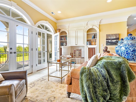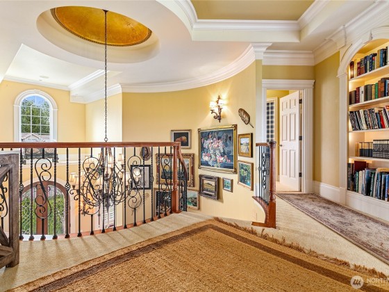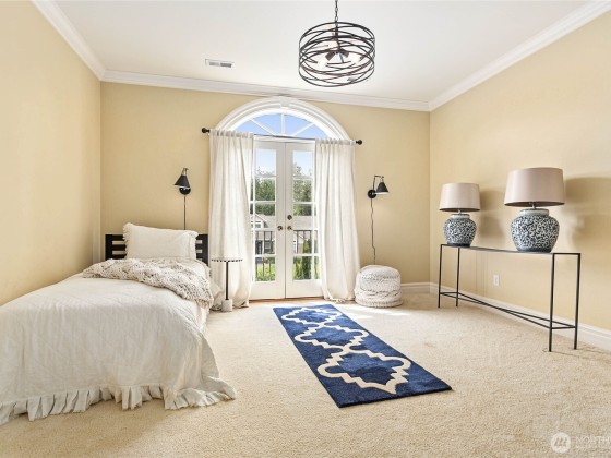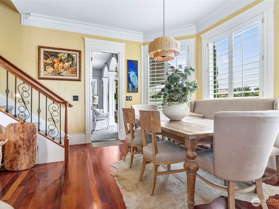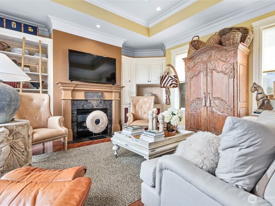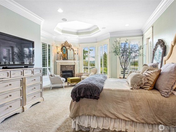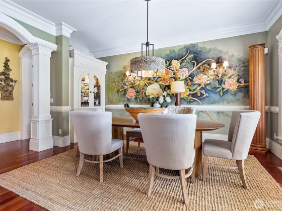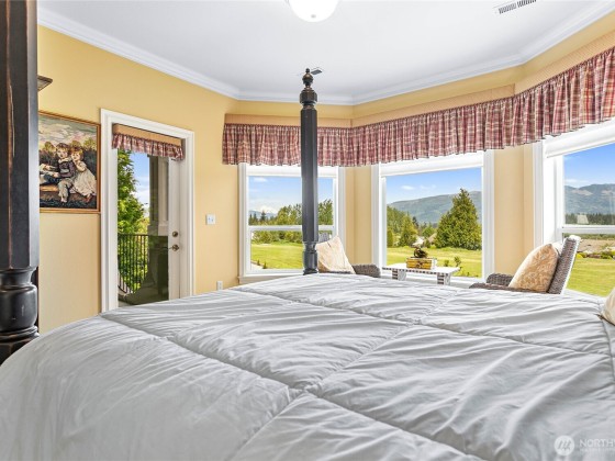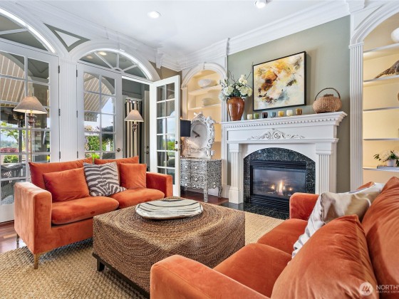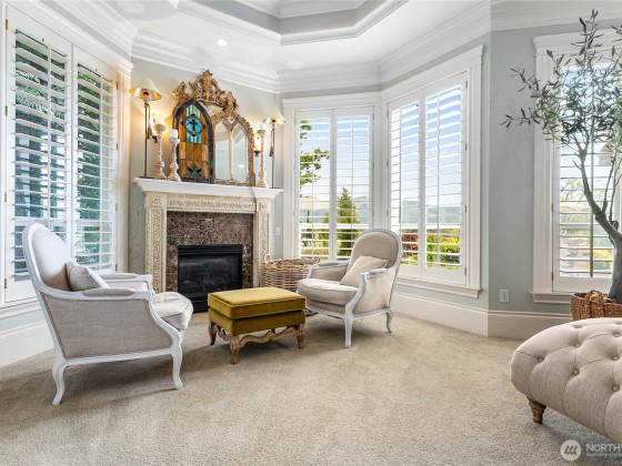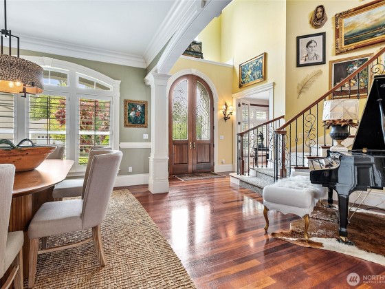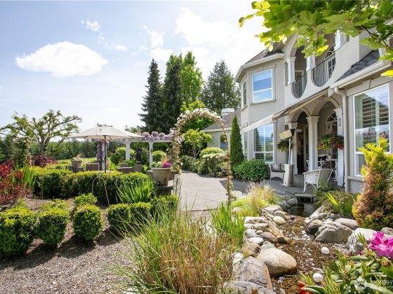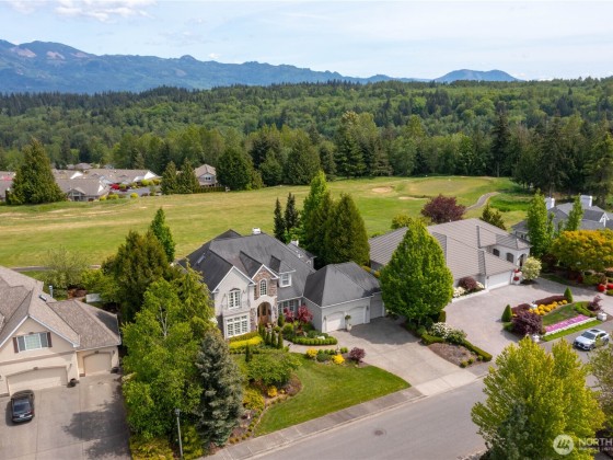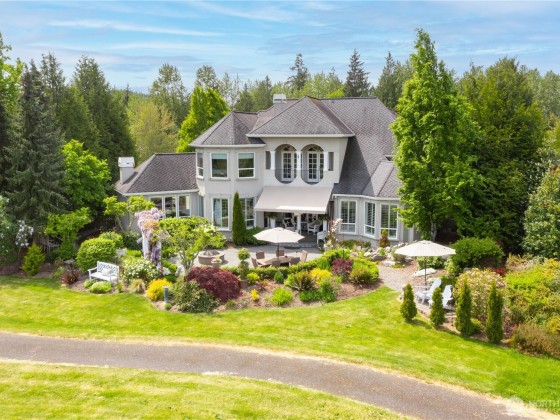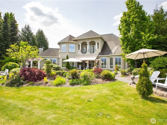 This elegant custom home with Mt Baker views awaits you in Eaglemont. 4,729 sqft of exceptional craftsmanship creates special spaces, large gathering areas & captivating architectural details - all while preserving true single-floor living. The main floor stuns with a luxurious primary suite, walk-in closet & sitting area overlooking the garden. Brazilian Cherry hardwood flows from the grand entry through a chef’s kitchen into a quiet sitting area. Up the sweeping staircase, a guest suite with full bath and a sitting area with veranda. Numerous extras: built-ins throughout, back staircase, a dreamy patio, fireplaces, landscaping & more. A true jewel in Eaglemont.