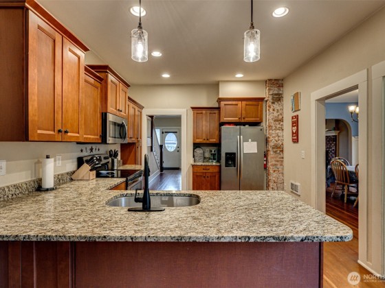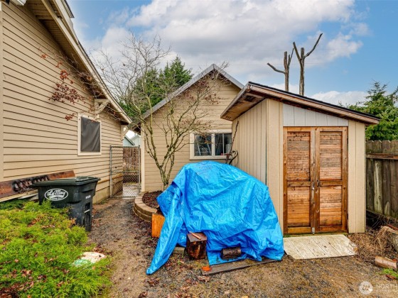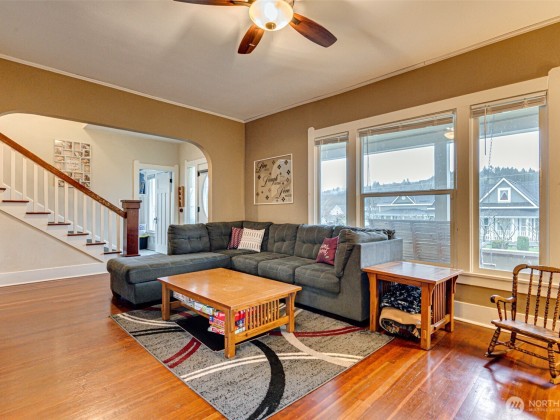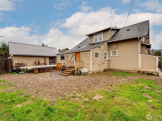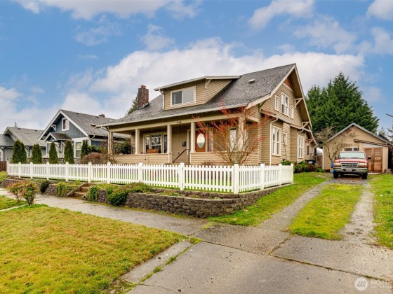 Price Adjustment! Charming 1920 Craftsman rich in history and character, blending original details with modern updates. Hardwood floors, detailed millwork, elegant archways, and built-ins with hidden storage add to its appeal. The updated kitchen features granite counters, stainless steel appliances, and a built-in desk. Main level includes a living room with a fireplace, formal dining room, a den, an office, and a primary bedroom with a walk-in closet. A clawfoot tub highlights the main bath. Upstairs offers a family room (or 4th bed), two bedrooms with large closets, and a playroom. A fenced yard, covered front porch, detached garage with power (ADU potential), and storage shed complete the home. Minutes to downtown Chehalis Washington.