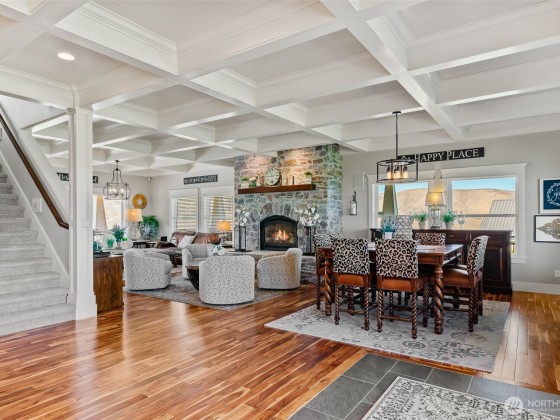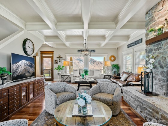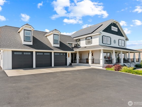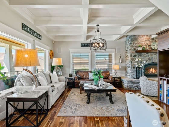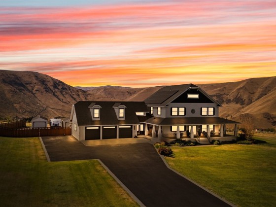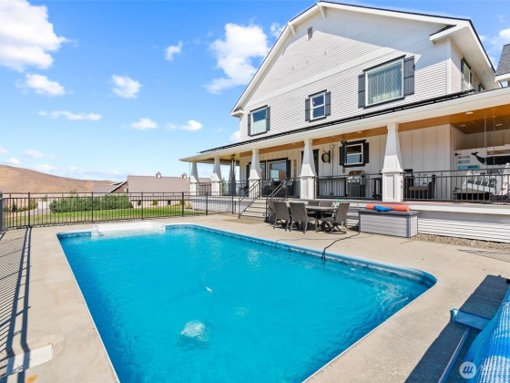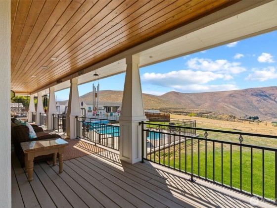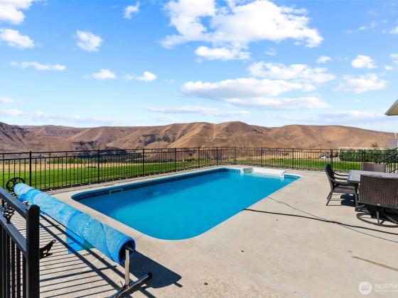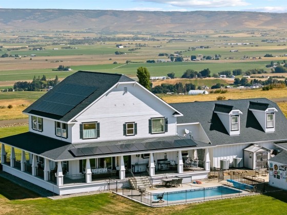 Step into luxury living w/ this stunning 4-bed, 3.5-bath custom home w/ breathtaking valley views & high-end finishes throughout. Acacia hardwood floors, a beautiful coffered ceiling & a show-stopping fireplace create an inviting & elegant main living space. The large chef’s kitchen is designed to impress, featuring quartz countertops & large walk-in pantry. The primary suite offers a peaceful retreat w/ a spa-like bathroom, soaking tub, & an expansive walk-in closet. Huge 4th bedroom/bonus room above the garage. Step outside to your own backyard oasis complete w/ an 11,000-gallon chlorine pool, custom wrought iron railings, irrigation, & built-in speakers inside & out. RV parking & security system. 63 solar panels keep energy costs down!