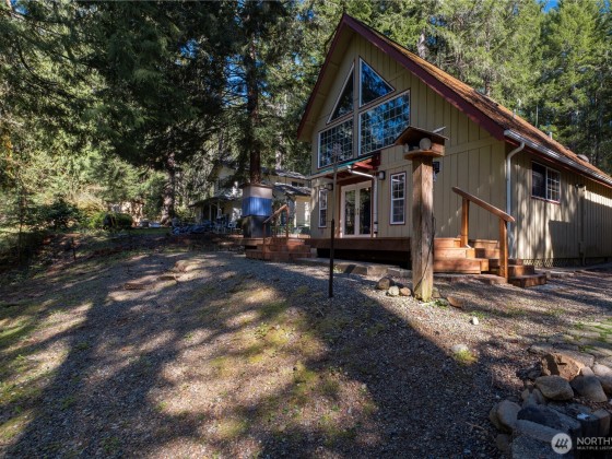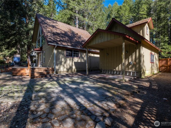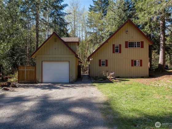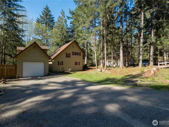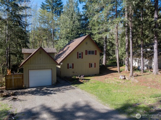 Smart investment, solid home, and a peaceful retreat! This 2-bedroom, 1.5-bath, 1100 sq ft home is ideal as a full-time residence, vacation getaway, or income property. Nestled against a serene greenbelt with a creek, the setting offers natural beauty and privacy. Enjoy an open living area with a propane stove and a spacious deck perfect for relaxing or entertaining. Includes a large garage with storage above, RV parking, power for a hot tub and extra space for toys or tools. Located minutes from Lake Cushman, Hood Canal, public boat ramps, golf, hiking, and fishing. Cozy in the winter, cool in the summer. This is your Lake Cushman escape! Home has fresh interior paint and new carpet in the upstairs area.