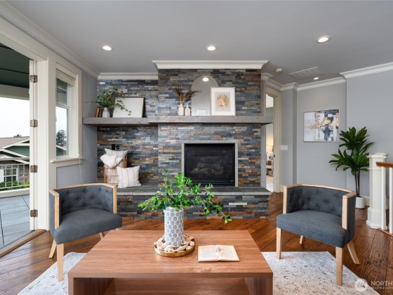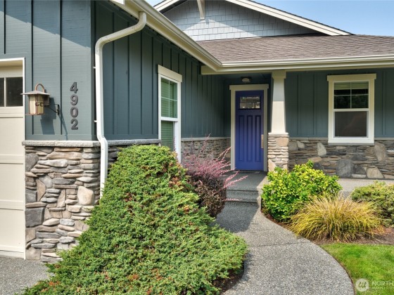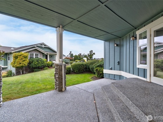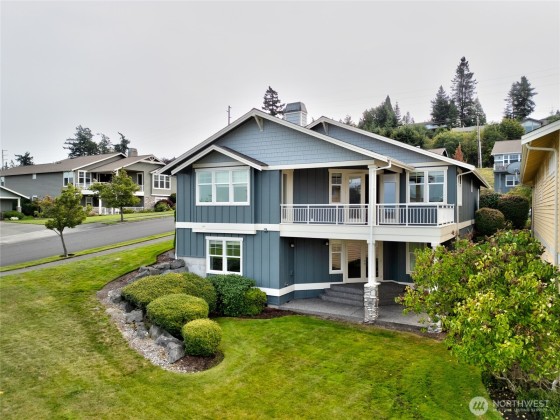 Quality Ron Paulk built Home, a beautifully home w/ solid wood doors, detailed ceiling and baseboard trim. Main level living offers Primary & second bed rm and bonus office/flex rm with French doors, all main level. The kitchen with long quartz bar, living rm stone fireplace, and seamless flow to French doors view deck ideal for entertaining. Primary suite showcases sweeping channel views of San Juan Islands, plus spa like bath and lg walk-in closet. Lower level/ w guest suite, and potential cool/wine room, and patio with hot tub wiring. Whole-home with built-in speaker in every room including sound system completes this retreat. Enjoy care free maintenance with landscaping, exterior painting and roof replacement included in HOA fee.
