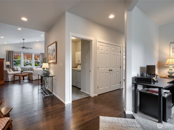 Woodside Active Adult 55+ Community! Enjoy private and one level living, with easy level drive way. This home offers an open-concept layout that seamlessly integrates the living, dining, and kitchen areas. This single-level 1944sqft home features three bedrooms plus a study, two bathrooms, and a two-car garage with extra storage. The master suite is thoughtfully situated away from the guest rooms, ensuring privacy. High-quality finishes include hardwood flooring, stainless steel appliances, custom tile backsplash and granite slab countertops. Plus, central AC. The landscaped and irrigated yard is maintained by the homeowners' association. Residents can also enjoy the community lodge and park.