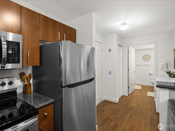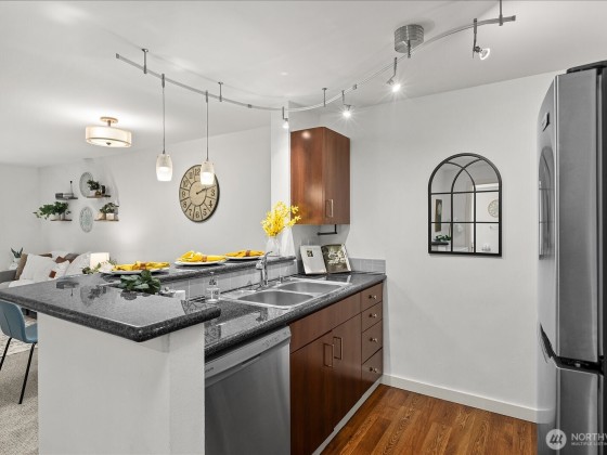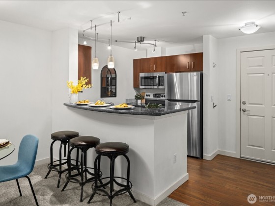 $2,500 LENDER CREDIT AVAILABLE! Welcome to downtown living! This 1bd/1ba condo is a stylish retreat. Open living area w/ breakfast bar, dark wood cabinets, granite counters & stainless steel appliances. Juliet balcony overlooks the private courtyard. Spacious bedroom w/ extra large walk-in closet and a full bath w/ tub & tiled shower. In-unit washer & dryer! Amenities include secure entry, assigned garage parking, package lockers, resident lounge, & extra storage, including for bikes. Fresh paint & new blinds. Pet-friendly, up to 2 cats or dogs. Premium finishes & all appliances convey, including A/C, fridge, washer & dryer. Perfect low-maintenance home in the heart of Seattle’s energy!