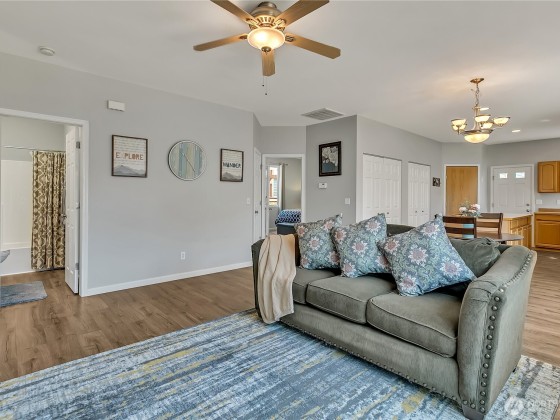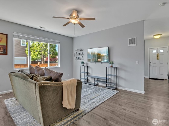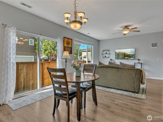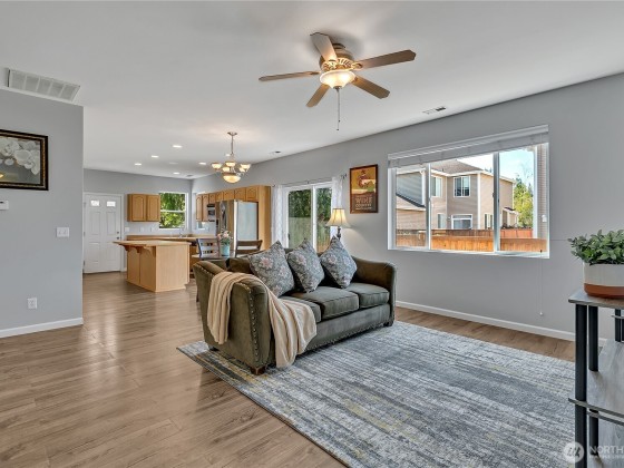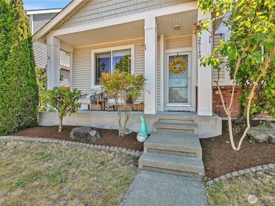 NO MONTHLY HOA DUES! Charming 2 Bedroom, 2 Full Bath Rambler in Maple Valley! This beautifully maintained rambler features hardwood laminate flooring and solid wood doors throughout. Spacious kitchen with large island & walk-in pantry, gas fireplace and remodeled primary bath with oversized soaking tub and heated floors. Enjoy the versatile 2nd bedroom/office with barn door, full-size washer & dryer, ceiling fan, and all appliances included! Corner lot with 2-car garage (alley access), fenced patio & side yard—great for pets. Relax on the front porch and watch the sunset! Close to parks and schools. Furnace serviced May 2025. Move-in ready!