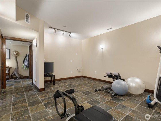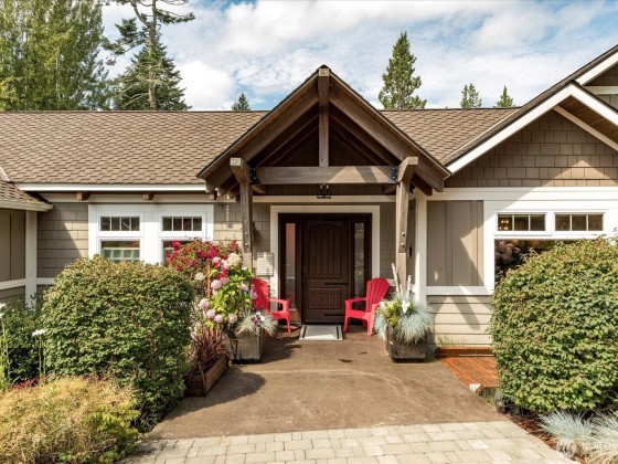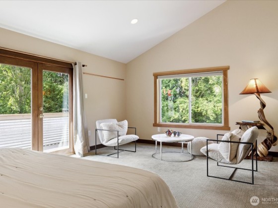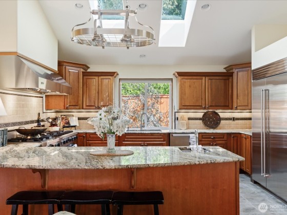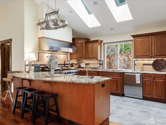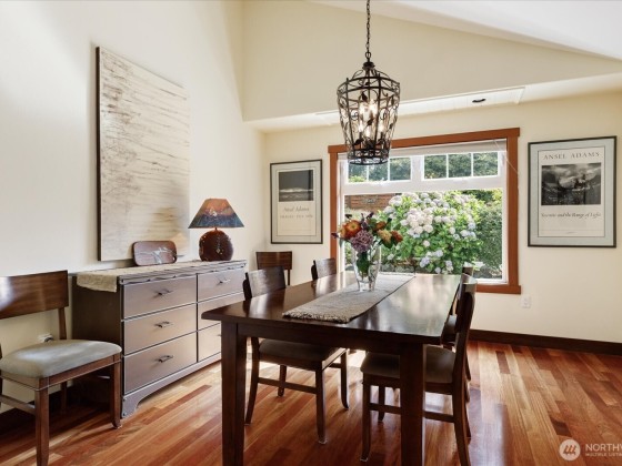 Nestled in sought-after Gibraltar Heights, this beautifully updated home blends Northwest-inspired architecture with modern luxury. Vaulted ceilings with exposed beams and expansive windows create a light-filled, welcoming ambiance. The main level features Brazilian cherry floors, a dramatic living room, formal dining, home office, family room, and a tranquil primary suite. The chef’s kitchen includes high-end designer appliances, ideal for entertaining. The lower level offers a second primary suite, slate tile floors, a custom wine cellar with copper sink, bonus room, and third bedroom—perfect for guests or multigenerational living. Additional highlights a 50-year Paramount roof, spa-like baths (2015 & 2018) & premium finishes throughout.