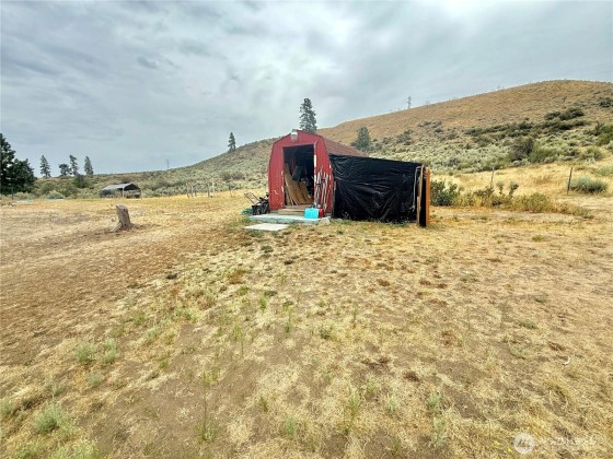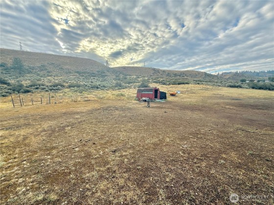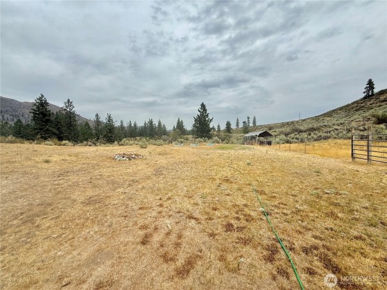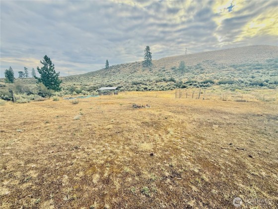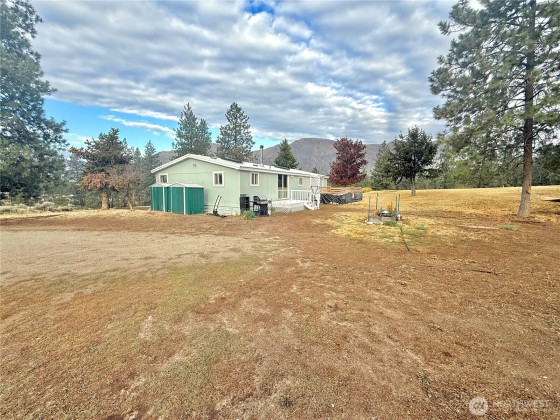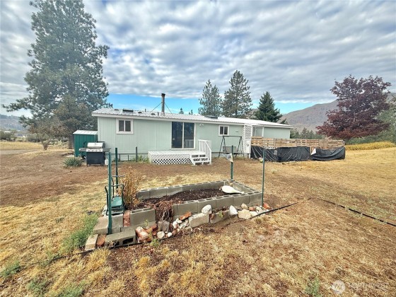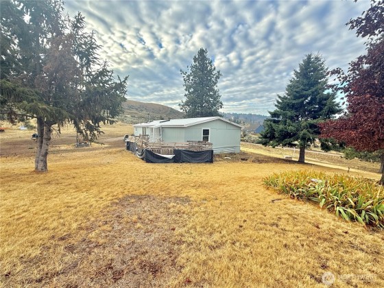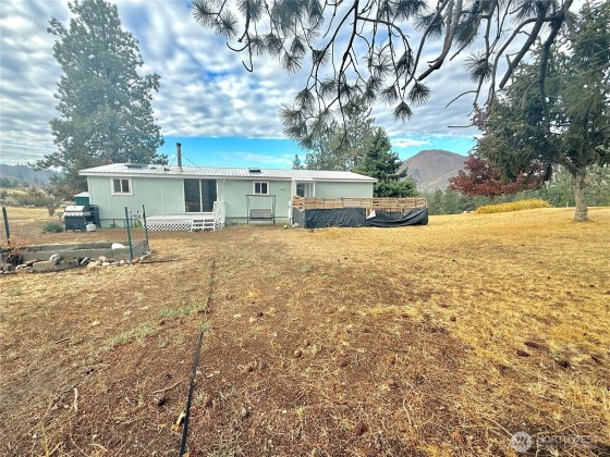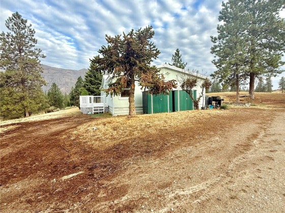 Tonasket - Crumbacher - 7.5+ acres backed up to conservatory land w/2.5 acres completely fenced. 360 Degree Mountain Views! 3 bedroom/2 bath 1456sqft manufactured home w/underground sprinkler system, shed with power supply, large garden space, carport for storage, and firepit. Living room, dining room w/pellet stove, kitchen w/pantry, laundry room, primary bedroom w/oversized en-suite attached bathroom including double vanity, skylights, and bathtub. Additional two bedrooms w/full bathroom on opposite side of home. All appliances stay. Completely fenced w/graveled driveway. Metal roof. Community Water - Westvue Water Association. CCRs. Septic $299,900 MLS-2413906/H-3701