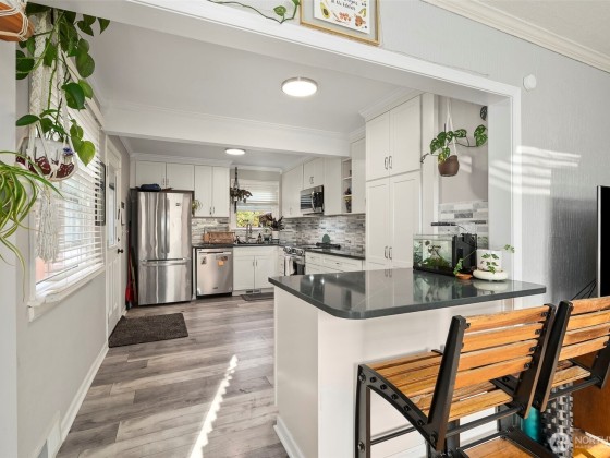 Welcome to Fircrest! This 3 Bed 1 Bath 1200+/-sqft home offers modern and convenient updates while maintaining its classic charm. Upon entry you are greeted by hardwood floors, crown molding and bay windows that provide an abundance of natural light. Freshly updated kitchen features quartz countertops w/bar seating, stainless appliances, tile backsplash and shaker cabinets. Primary bedroom w/flex area is perfect as a reading nook or walk in closet. Enjoy the privacy of the fully fenced backyard w/ patio, gazebo and raised garden beds. Basement offers plenty of space for possibilities beyond storage. Located only a few blocks from wonderful neighborhood amenities including Fircrest Park, the aquatic center, playgrounds and pickleball courts.
