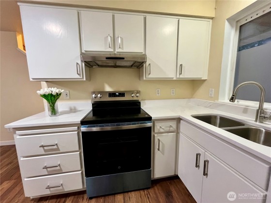 Top-floor, 2 story condominium/townhouse. Home features open living spaces on the main with a powder room. Upgraded stone countertops, fresh paint throughout. New oven and dishwasher. Upstairs are the 2 generous bedrooms both with full baths attached. Complex has only 6 units and low dues. Well maintained unit with hardwood floor and paint. Enjoy the bright and sunny balcony off of main floor living area. Right next to Walter E. Hall Park & golf course, many commuting options and Boeing is right there. Two off-street private parking spots in the back. Entrance is access from 11th Dr. W, not from Casino Rd.