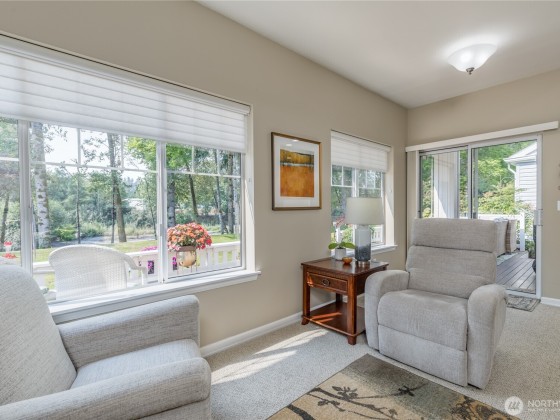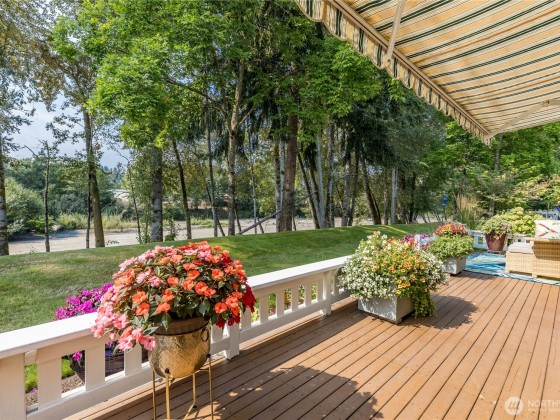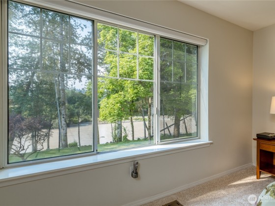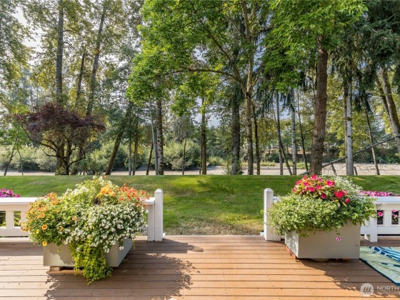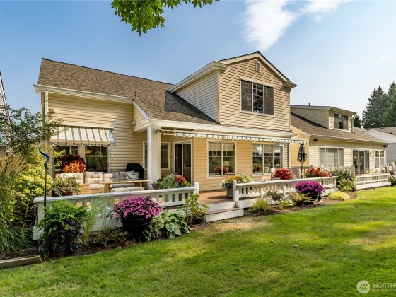 Welcome to this Riverwalk Condominium, tucked away on a quiet cul-de-sac and backing up to the scenic Puyallup River! Enjoy peaceful views from nearly every window and direct access to the walking trail just steps from your expansive deck (with retractable awnings!), one of the largest in the community. The inviting layout features a bright kitchen with white cabinetry & hardwood flooring, plus formal living & dining areas with a cozy gas fireplace. Main floor bedroom or office has adjacent full bath, perfect for guests. Upstairs, the spacious primary suite boasts river views, walk-in closet & double sinks. Central A/C, wired for generator, and HOA-maintained roof, siding & landscaping. Close to parks, trails, and charming downtown Sumner!