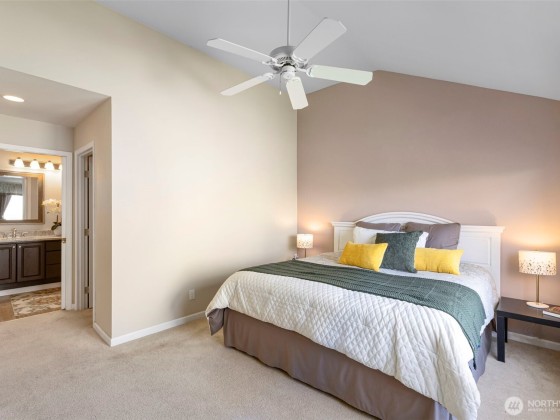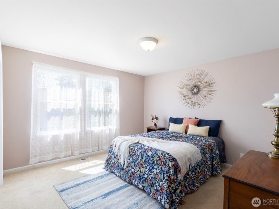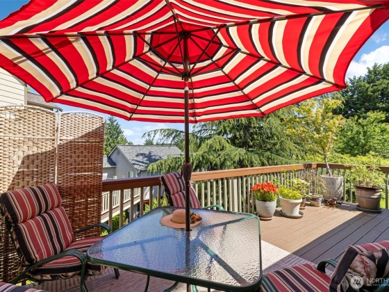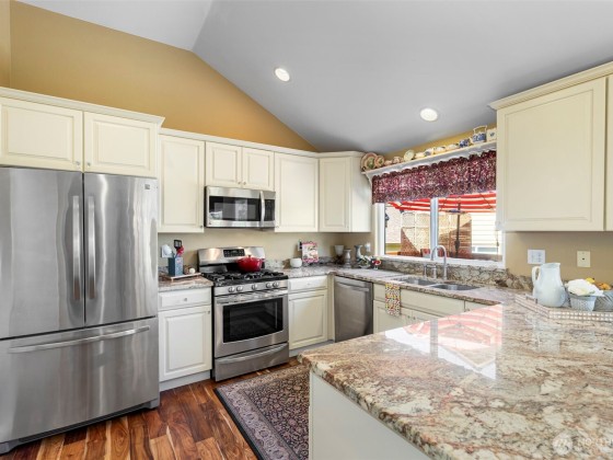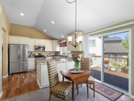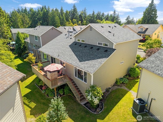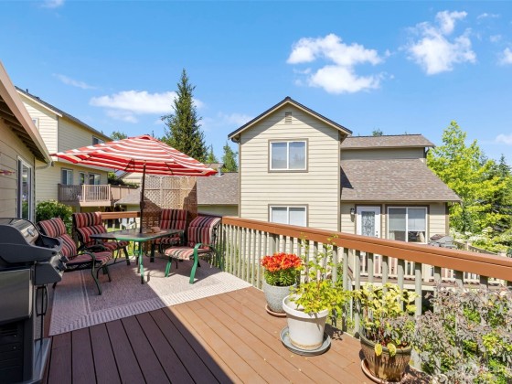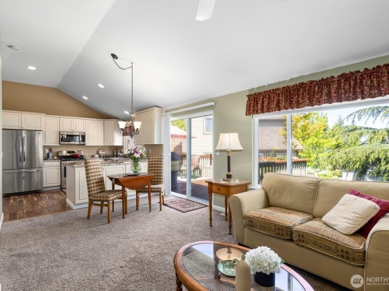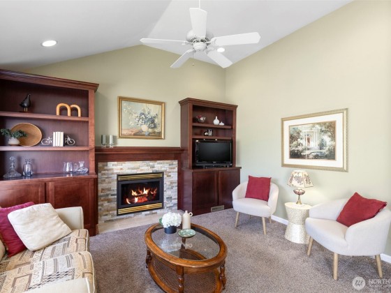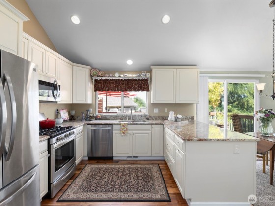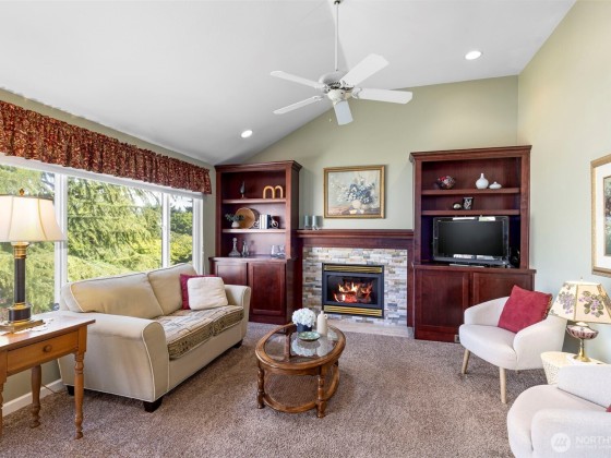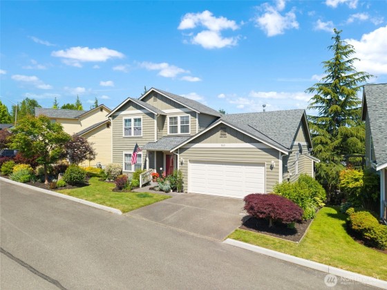Enjoy easy living in this updated 3-bedroom Silverdale home in the Summerwind Community! Open & bright living area with vaulted ceilings, gas fireplace & built-in cabinets. Elegant kitchen with custom cabinets, granite counters, walk-in pantry & stainless steel appliances. Slider to the huge back deck is perfect for entertaining. Main floor primary bedroom with large walk-in closet, guest bedroom, full bath & utility room. Upstairs guest bedroom and spacious full bathroom. Relax on the cozy covered front patio with sun shade and take in the lush landscaping. Attached 2-car garage and full yard sprinkler system. Community HOA covers full yard landscaping. All just minutes to the hospital, navy bases, easy highway access, shopping and dining!