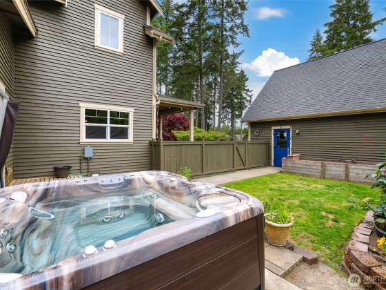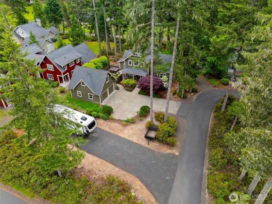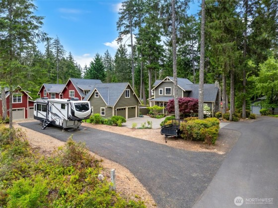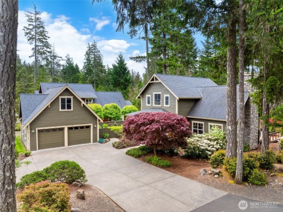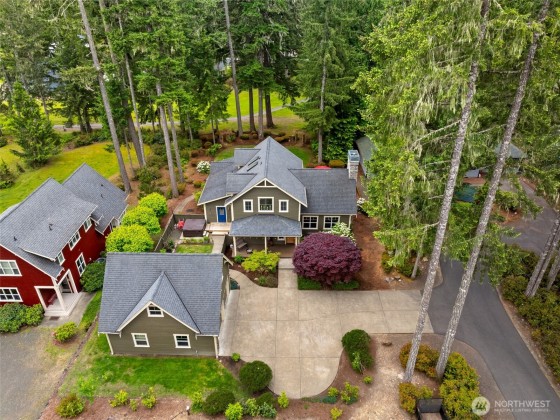 Alderbrook Golf Course fairway dream home! Beautifully maintained on rare oversized double lot. Quintessential charm w/covered front porch & expansive entertainment-sized backyard decks overlooking pristine gardens & fairway. Inside a well designed kitchen w/ ST ST appl's & granite counters, hardwood floors, custom millwork, & upgraded finishes throughout. Gas fireplace anchors great room w/soaring ceilings & tall windows. Main floor primary ensuite w/5-piece bath & WIC. Upstairs, 2 spacious bedrooms w/vaulted ceilings & full bath. Detached 2-car garage w/ ample storage & potential for guest suite or extra living space. Owners enjoy unlimited golf for 2, a vibrant clubhouse community, and minutes to the world-class Alderbrook Resort & Spa!