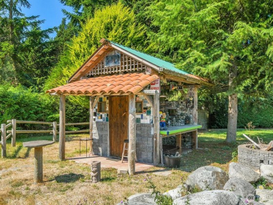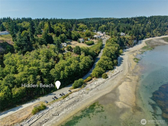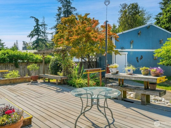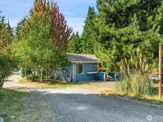 Welcome to your EAST-facing home with a fully fenced yard and beautiful privacy hedge! The 24x48 detached shop offers three bays, an air compressor, a storage loft, and finished space with a half bath—ideal for a home business, studio, or possible DADU/guest suite. Inside, vaulted ceilings and a circular floor plan fill the home with light, with bedrooms at opposite ends for privacy. Features include a five-piece primary bath, propane stub for a free-standing fp, ductless heating/AC, and a newer hard-wired generator. All-level ½-acre lot with cantina and firepit for outdoor enjoyment. Community access to Hidden Beach and boat launch. Just 20 minutes from the ferry and south of the Navy flight path. Clean and ready for your personal touches!