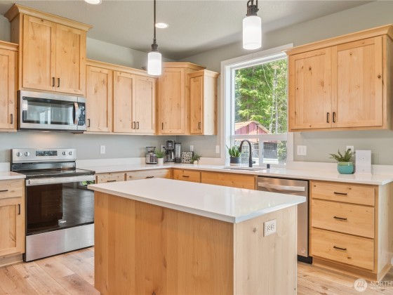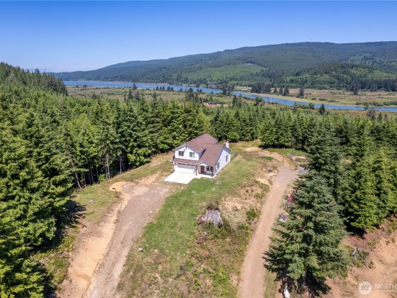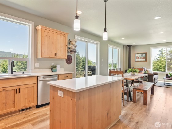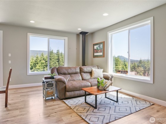 Modern Living meets natural beauty nestled on 13+ forested acres, offering privacy, space and style. Soaring windows flood the space with natural light and frame sweeping views. The grand kitchen has both beauty and function, featuring quartz countertops, stainless steel appliances, abundant storage and counter space. It flows into the dining area and family room, where a wood stove adds warmth and charm. The primary suite is a true retreat with a large walk-in closet and a spa-like bathroom. Two additional bedrooms and 1.5 baths round out the thoughtfully designed floorplan. RV parking, space for a shop and a small pasture ready for your hobby farm dreams. Potential to subdivide (buyer to verify). This is Northwest living at its best!