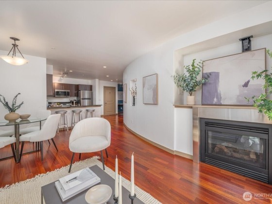 The Metropole in Ballard's heart offers exceptional value in the area's most desirable building. This bright 3rd-floor unit features an open floorplan maximizing living space, with a huge kitchen, office nook, and oversized bathroom. The primary bedroom feels like a retreat with a pass-through fireplace connecting to the living room and a giant walk-in closet. The east-facing balcony off the living area brings in natural light and fresh air all day. As a bonus, the upstairs neighbor added sound-buffering mats to their floors for extra quiet. Secured parking space (w/option for EVC) and storage. This centrally located home combines comfort and convenience in one perfect package, making it an ideal place to call home in sought-after Ballard.