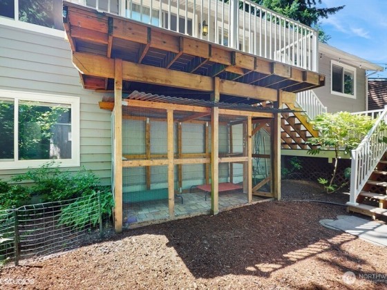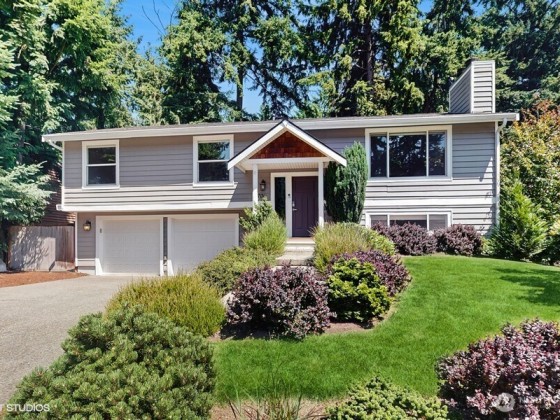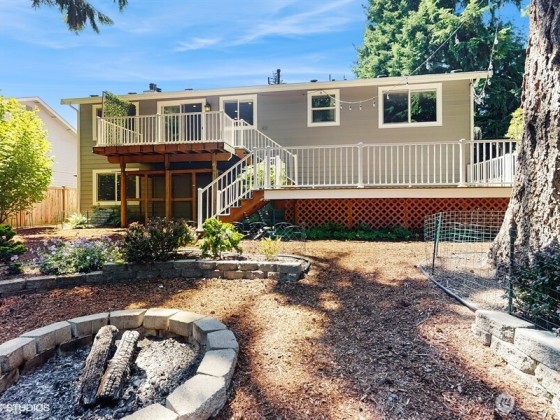 This Twin Lakes gem has it all & YES it has central A/C!, enjoy vaulted ceilings, hardwood laminate floors, & a cozy fireplace perfect for relaxing evenings. The kitchen features granite counters, tile backsplash, stainless appliances, & a center island ideal for casual meals. The spacious primary suite has a full bath and large closet. Downstairs offers a huge family room, flexible 4th bedroom or office, and a sleek 3/4 bath w/newer W/D. Fresh carpet & paint make it move-in ready. The oversized 2-car garage fits vehicles, a workbench, & even a second fridge. Out back, enjoy a two-tier Wolff composite deck, fenced yard, fire pit, built-in dog kennel, & shed - all backing to the Olympic View Park greenbelt for privacy & daily nature views.