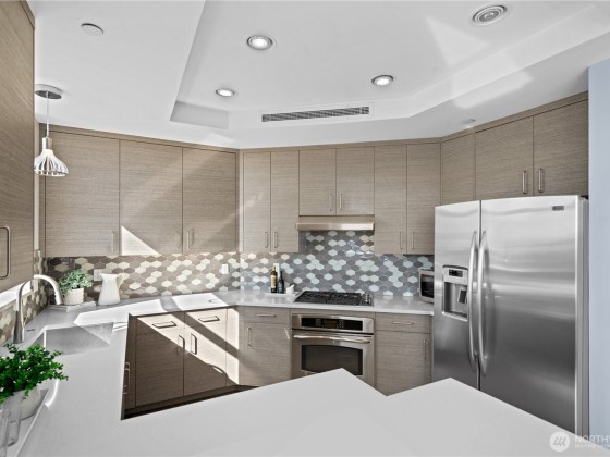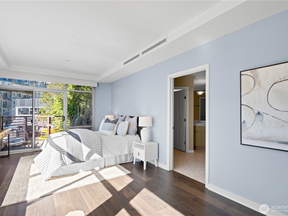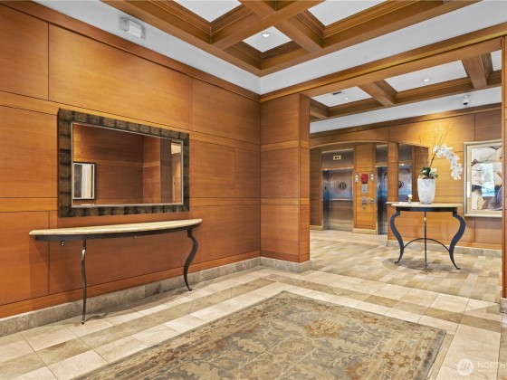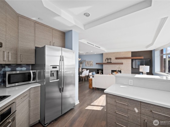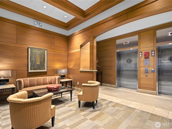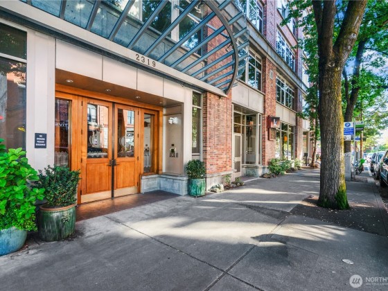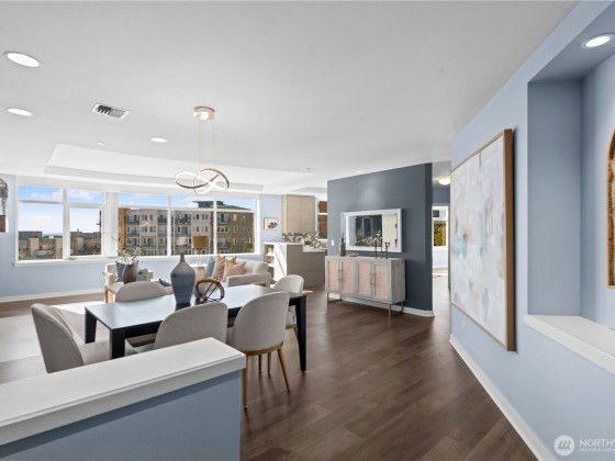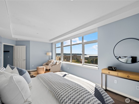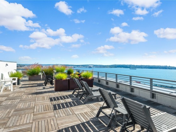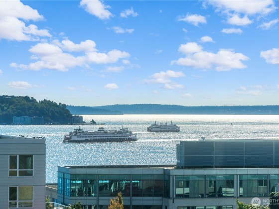 The exceptional Pomeroy is a boutique building unlike anything else in Belltown with concrete and steel construction, perched over a designated city park, and offering views galore. This happily spacious home with almost 1600 square feet of luxury living has been recently updated with engineered hickory floors, built-in cabinetry, and a kitchen to please the cook. Elliot Bay and passing ferries can be seen through every window! The large primary suite will knock your socks off and has one of the few balconies in the building. This corner unit faces west, east AND north so the outlooks are ever engaging. Two full baths. Full sized laundry room. Separate home office. The Pomeroy also has the best rooftop deck around, just redone and glorious.