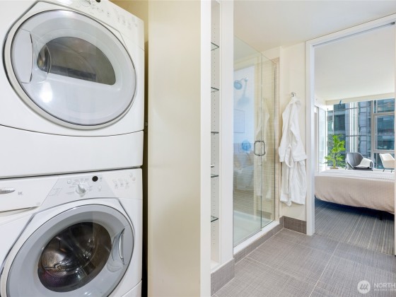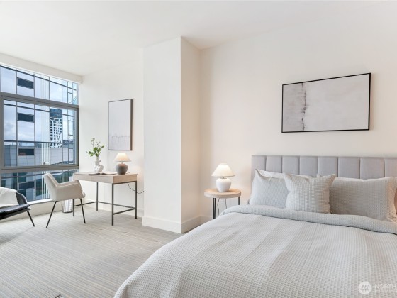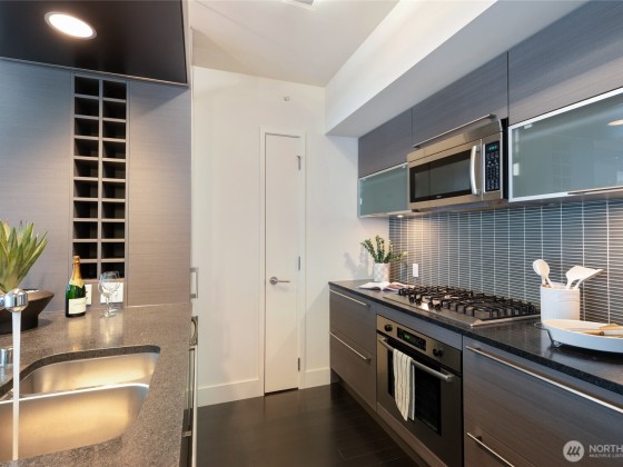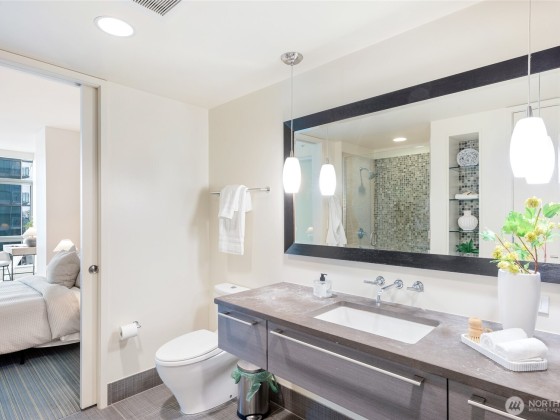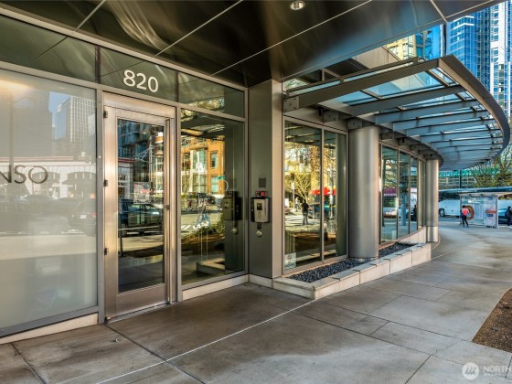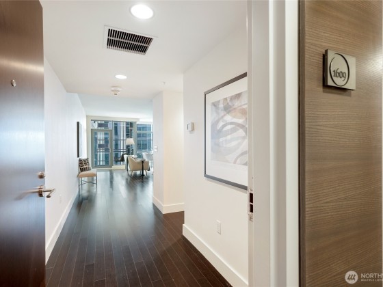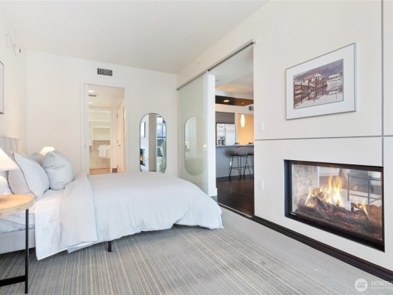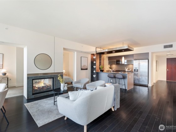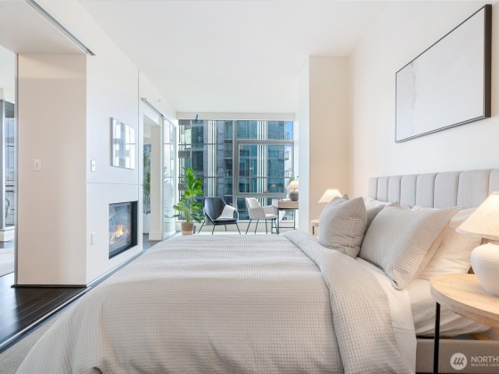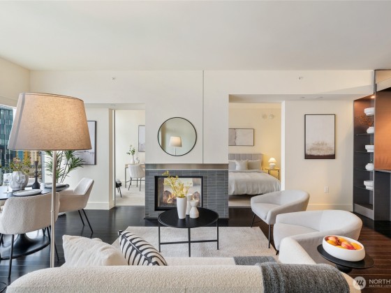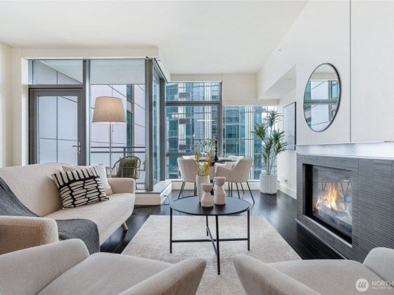 16th floor beauty in ENSO - perfectly located and well-run building in Denny Triangle. Flooded w/ natural light & a wall of windows to urban views from this modern, well-designed w/ spacious floorplan, includes office area and half bath! Fresh finishes include hardwood, Bosch appliances & slab granite counters. Dual-sided fireplace for additional ambiance. Large bedroom suite w/ room for office, large walk-in closet. In-unit laundry room. Serene patio for relaxing or working from home. Secure garage parking+ storage. Concierge, Gym, Club room w/ sunny patio & available guest suite. Across the street from Whole Foods, blocks from Amazon Sphere. One of the best locations in the city. Seattle awaits you... just steps outside your front door.