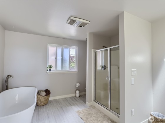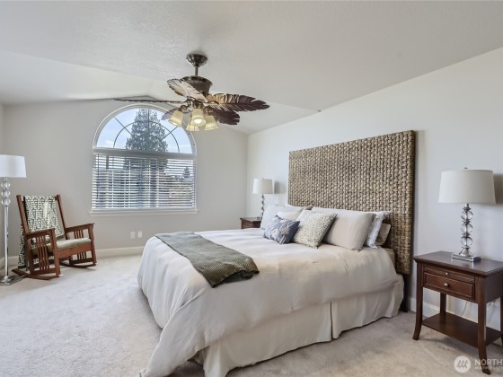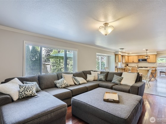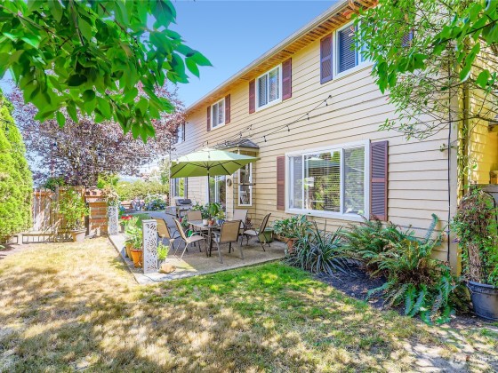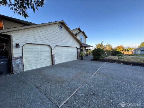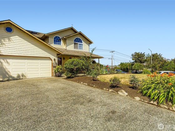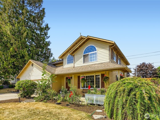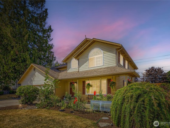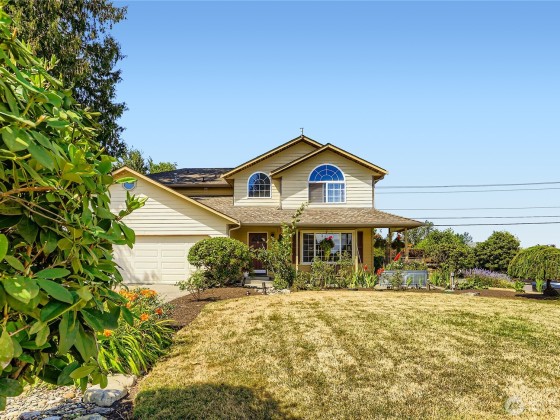 Beautiful Views, Large 5-bedroom home with triple garage on a corner lot on cul-de-sac. Freshly painted, lushly landscaped, with nice views of the Cascades. Modern kitchen with S/S appliances; large living and dining room area; eating spaces in kitchen blend into the large family room featuring warm engineered cherry hardwood floors and a gas fireplace; The bathrooms have recently been stylishly upgraded. The primary bedroom features a five-piece suite with a pedestal tub and large walk-in closet. Pleasant patio space surrounded by gardens with private hot tub adjacent. Unusual amount of storage space is easily accessible on second level. Laundry is conveniently located on the second level. Make this warm, view home, your own.