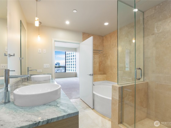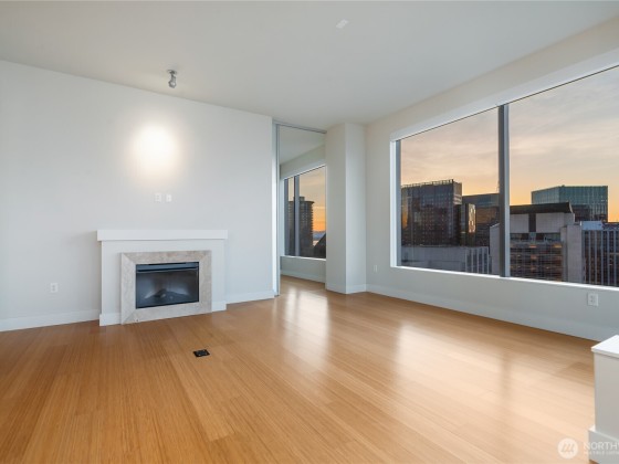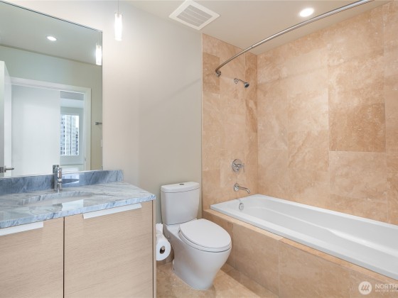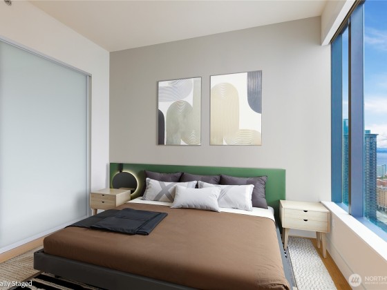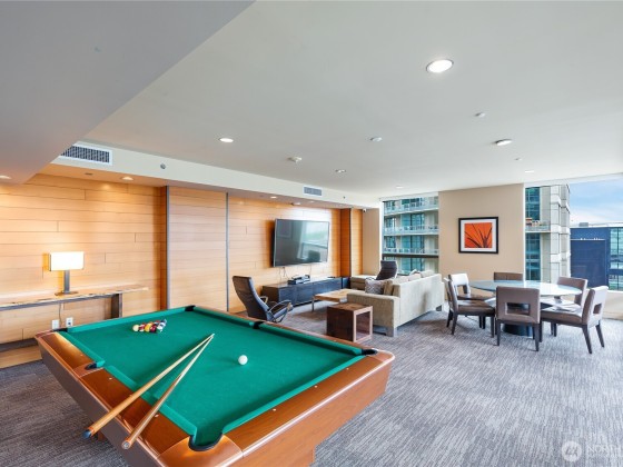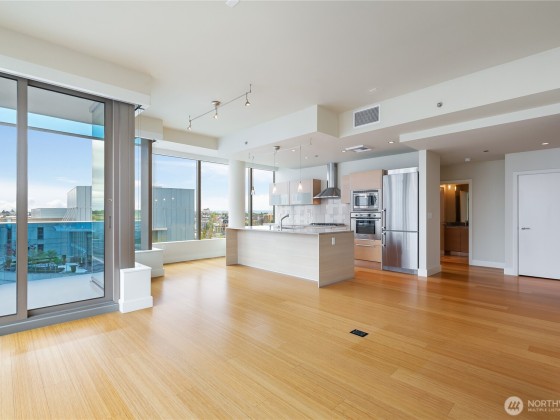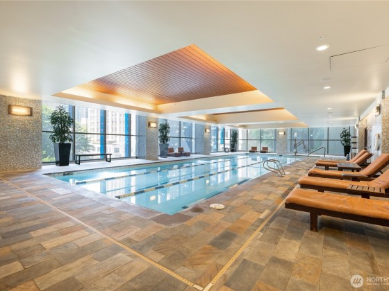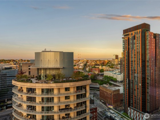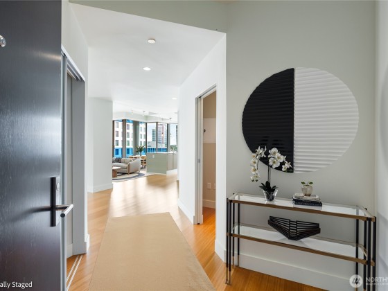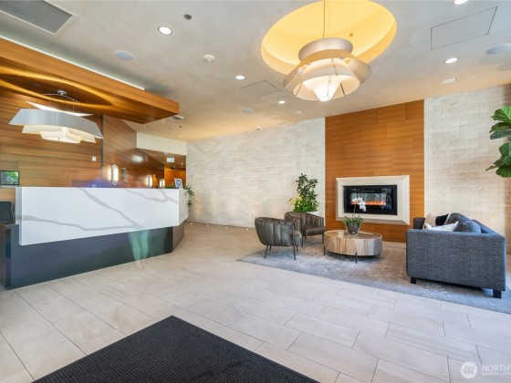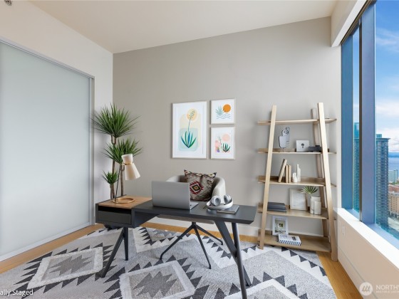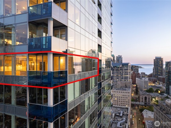Acquire luxurious city living at Olive 8: a glass-draped, concrete & steel high-rise in the heart of Seattle. This well-maintained home has 10’ ceilings, expansive windows & wood floors in sun-filled, open-concept kitchen/living/dining spaces. You will love the Pedini cabinets, top-line appliances & large island with bar seating. Two beds + den for use as a 3rd bed or office space; flexible for your lifestyle. A spa-inspired primary bath, patio, A/C, EV-ready parking & storage. Access world-class hotel amenities: room service/cleaning, saline pool, jacuzzi, steam room, sauna, gym & yoga studio + room discounts. Close to Seattle’s best theaters, galleries, restaurants, shopping & transit. Covered dog run & no rental cap! (Virtually staged).