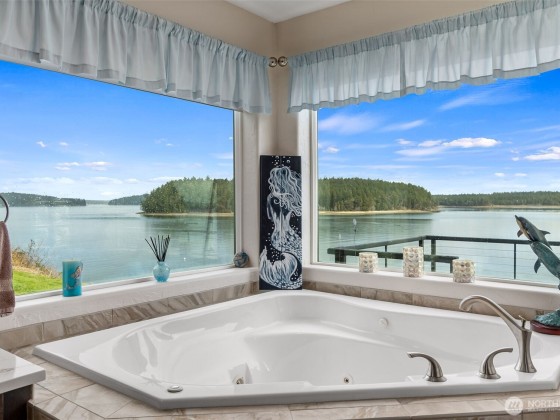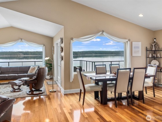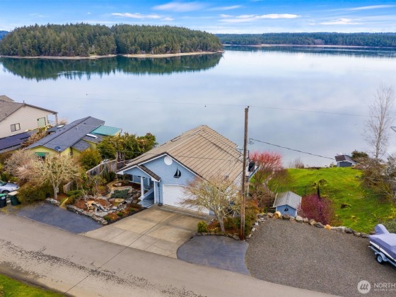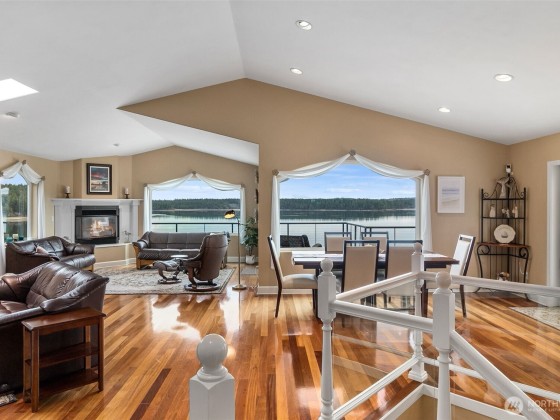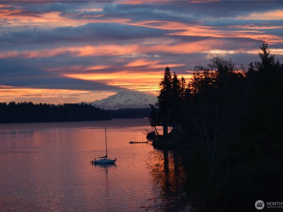 Enjoy stunning sunrises over Mt. Rainier & Eld Inlet from this well-kept custom waterfront home! Marvel at the awesome views of the Olympics & Hope/Squaxin Islands too! Easy access to bulk-headed WF w/ sandy, pebbly beach. Beautiful, fully fenced & irrigated grounds w/ a gorgeous water feature. Spacious view deck. Propane FA heat w/ AC. Open concept floor plan w/ skylights & vaulted ceilings. Generous use of cherry HW floors. Updated kitchen w/ soapstone counters, eating bar, & gas cooktop. Huge primary suite w/ WIC & door to view deck. Tiled primary bath w/ jetted tub, large WI shower, & 2-sink quartz vanity. This impeccably kept home has wonderful community amenities: marina, boat launch, clubhouse, & playground. This view can't be beat!