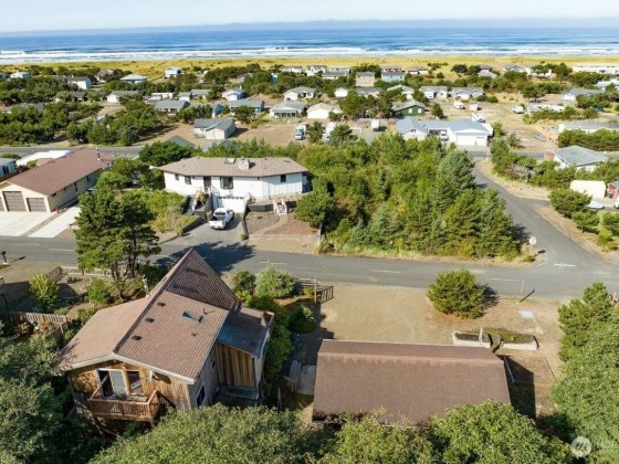 Dramatic ocean views on double lot, this unique home has warm wood interiors in the living room, kitchen, and dining room. New wood laminate floors on the main level. Wood stove keeps the home comfortable on cool nights. The kitchen has beautiful yet durable new countertops & deep sink. Two guest bedrooms & full bath w/new tile floors located on the main floor. Full-length deck for sharing sunsets & summer entertaining. 3rd floor Primary Suite has forest views, private deck, remodeled 3/4 bath, sitting room w/full ocean view. The ground floor has laundry room, family room, office, 1/2 bath, tool room & attached garage. Each room has wall heaters. Built 2012, large detached two car garage, heated shop, 816sqf. Life's good at the beach!