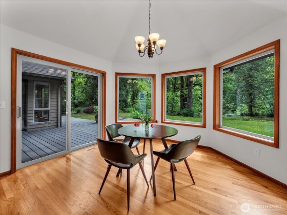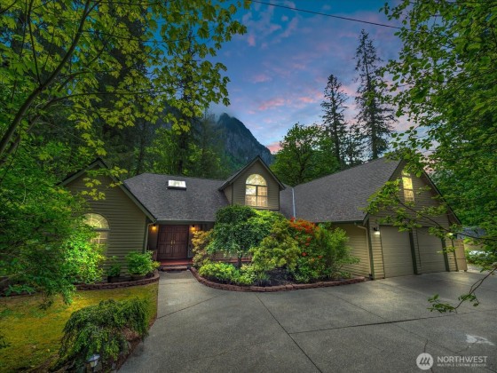 Peaceful living in coveted Ernie’s Grove! Custom 3,740sqft home w/152ft of low bank in a no flood zone on the North Fork Snoqualmie River. Stunning views of Mt Si, mountain goats, waterfalls & wildlife. Main living space features vaulted clear cedar ceilings & large windows. Family room with a cozy river rock fireplace is off the kitchen w/slab granite counter tops. Main floor primary suite w/fireplace & attached ensuite. Upstairs: 2 bedrooms, Jack & Jill bath, plus 2 bonus rooms. Enjoy fishing, launching your kayak & all nature has to offer from your own backyard or wind down on the expansive Trex deck. Home is equipped with an auto on house generator, new carpet, 3 car garage, RV parking. Close to trails, Downtown North Bend, and I-90.