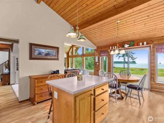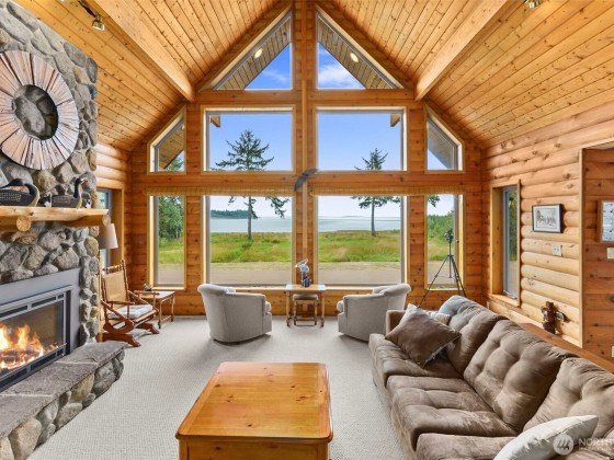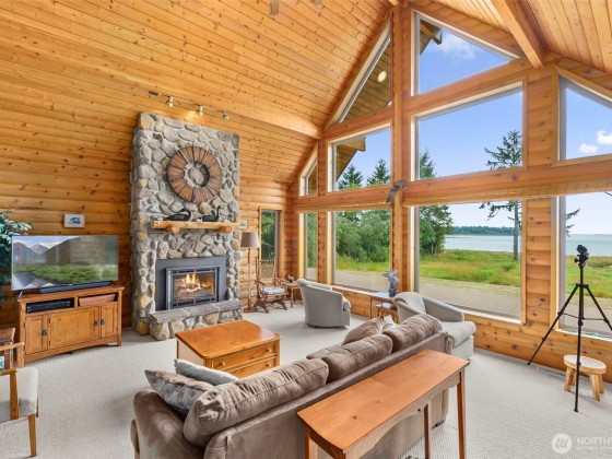 Welcome to your Pacific Northwest dream log cabin escape on North Bay—where rustic charm meets refined comfort. Handcrafted log home is nestled on nearly 7 acres of waterfront paradise w 200 ft of shoreline & unforgettable views of “The Rock.” Inside, the warmth of tongue-and-groove cedar ceiling & a towering river rock fireplace invites you to unwind. Open-concept living space includes a kitchen w pecan cabinetry, eating island & stunning views. Two bedrooms on the main level, a versatile loft & spa-like bath complete the home. Massive 30x48 shop for RV, boat, or at home business & room for all the toys. Includes finished office with ¾ bath and second kitchen! This is the ultimate PNW lifestyle. Use Kessler Lane vs Anderson for mapping!