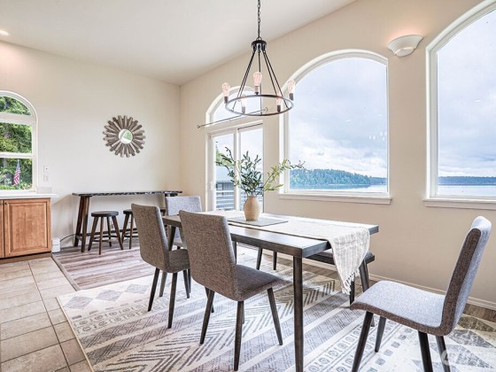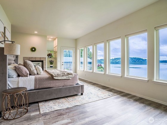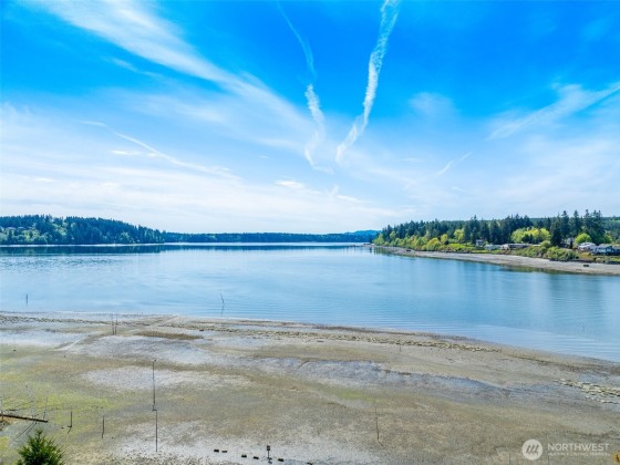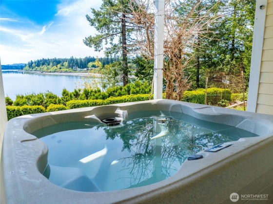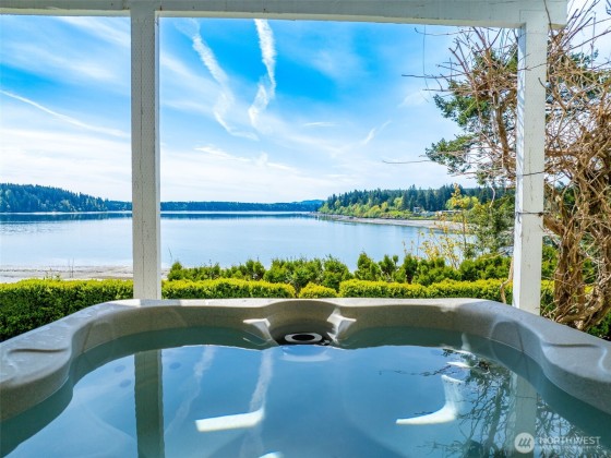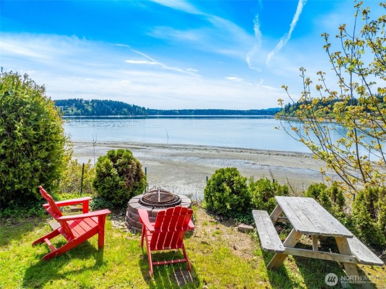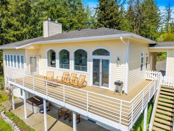 Enjoy stunning water views of Totten Inlet from nearly every room in this beautiful home, currently operated as a vacation home and short-term rental. A double-sided fireplace connects the living room and primary suite, creating warmth and romance. Perfect for entertaining, the home features two kitchens and a spacious wraparound deck. Downstairs offers a generous recreation, movie, or bonus room for endless possibilities. Outdoors, relax in the lush garden with a hot tub. An iron-gated entry welcomes you, while the primary bath offers a spa-like retreat with a Jacuzzi tub and separate glass-block shower. Additional amenities include a detached two-car shop, an attached one-car garage, and tideland rights per legal description.