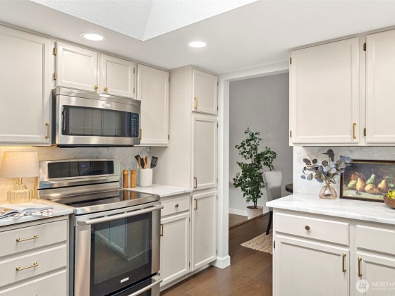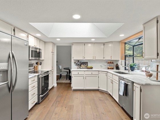 Imagine morning walks on quiet trails and evenings spent on the patio with friends. This Eastmont home offers the perfect balance of peace and convenience—nestled in a serene community yet just minutes from I-5. Skylights and large windows flood the home with natural light, while thoughtful updates create warm, inviting spaces. The kitchen features natural stone countertops, stainless steel appliances, updated hardware, and stylish lighting—ideal for everyday living or entertaining. All three bathrooms have been beautifully remodeled with modern finishes. Outside, enjoy over a quarter acre with a fenced yard, deck, patio, and RV parking—perfect for relaxing, gathering, and embracing the best of the PNW lifestyle.
