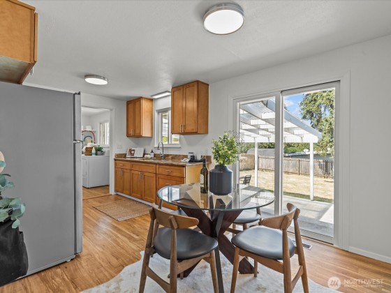 Charming rambler on spacious corner lot with a fully fenced back yard and large covered patio, perfect for entertaining. Located just blocks from the Angle Lake Rail station with nearby access to I-5, this home is ideal for any commuter or traveler. It's move-in ready with fresh paint inside and out, new appliances and furnace, cozy fireplace, and well-kept hardwood floors. The home is outfitted with Port Authority sound mitigation windows and doors which create a quiet interior haven. Upstairs loft space is perfect for an office, and connected attic space provides a generous and easily accessible storage area. Seller procured home inspection and sewer scope available!