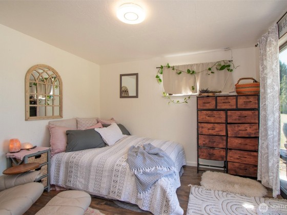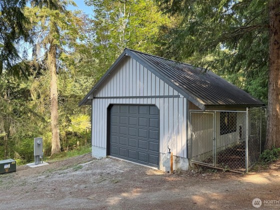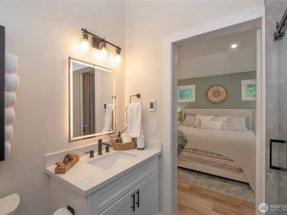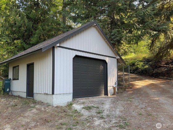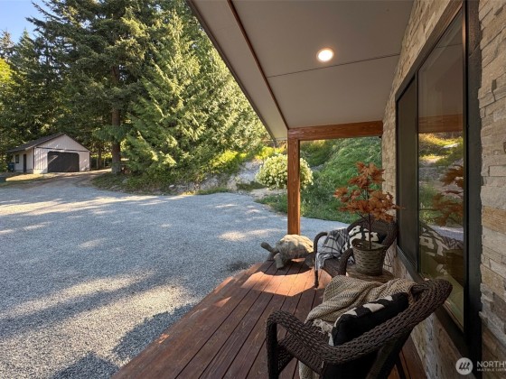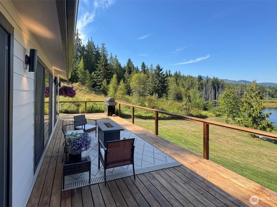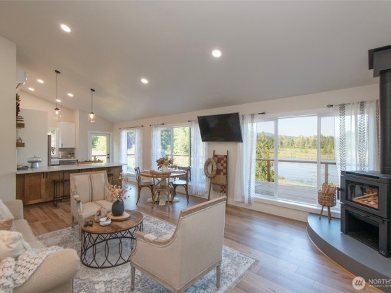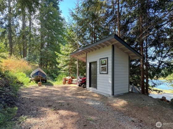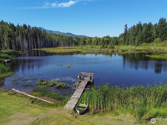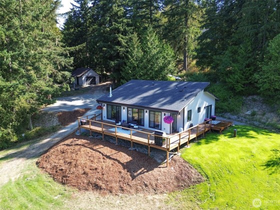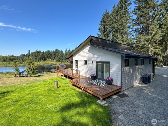 Abode Northwest is a modern, minimalist home inspired by the Pacific Northwest. With nearly 6 acres of premier waterfront on private Lake Sharon, this brand-new 2025 custom build boasts sweeping views of Lake Sharon and the Olympic Mountains, with a private dock and great bass fishing at your back door. Sunlit single-level 2 bed 2 bath living with vaulted ceilings and French doors to a west-facing deck for golden-hour sunsets. Spa-style primary bath with custom tile work and heated floors. Detached ADU with kitchen and bath, detached garage, cabana/gazebo, and outbuildings for gear and hobbies. Quiet dead-end lane—enjoy birdsong, stargazing, and the rhythms of nature. Classic simple Northwest living minutes to town, trails, and salt water