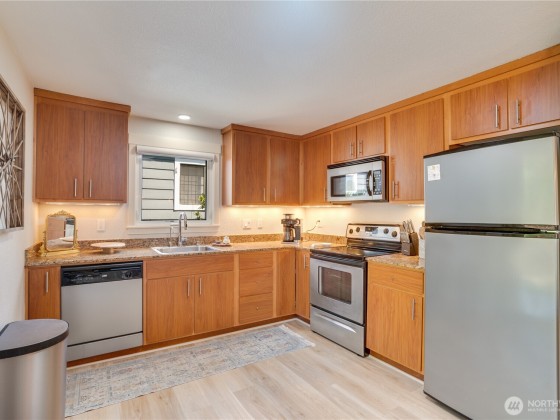 Welcome to The Cove! Nestled in Tacoma’s desirable North End between Westgate and Ruston, this ground-floor corner unit has been beautifully updated with brand new flooring and fresh paint throughout. Featuring 864sf, 2 spacious bedrooms, updated bathroom, an open-concept living/dining area with a cozy wood-burning fireplace, and an oversized laundry room with full-size washer/dryer + new cabinetry. The kitchen boasts granite countertops, stainless steel appliances, full-height cabinets, and under-mount lighting. Enjoy a private patio, extra storage, and covered parking. Set in a peaceful, park-like, pet friendly community within walking distance to Point Ruston, Point Defiance, and I-5. The perfect blend of comfort and convenience. Hurry!